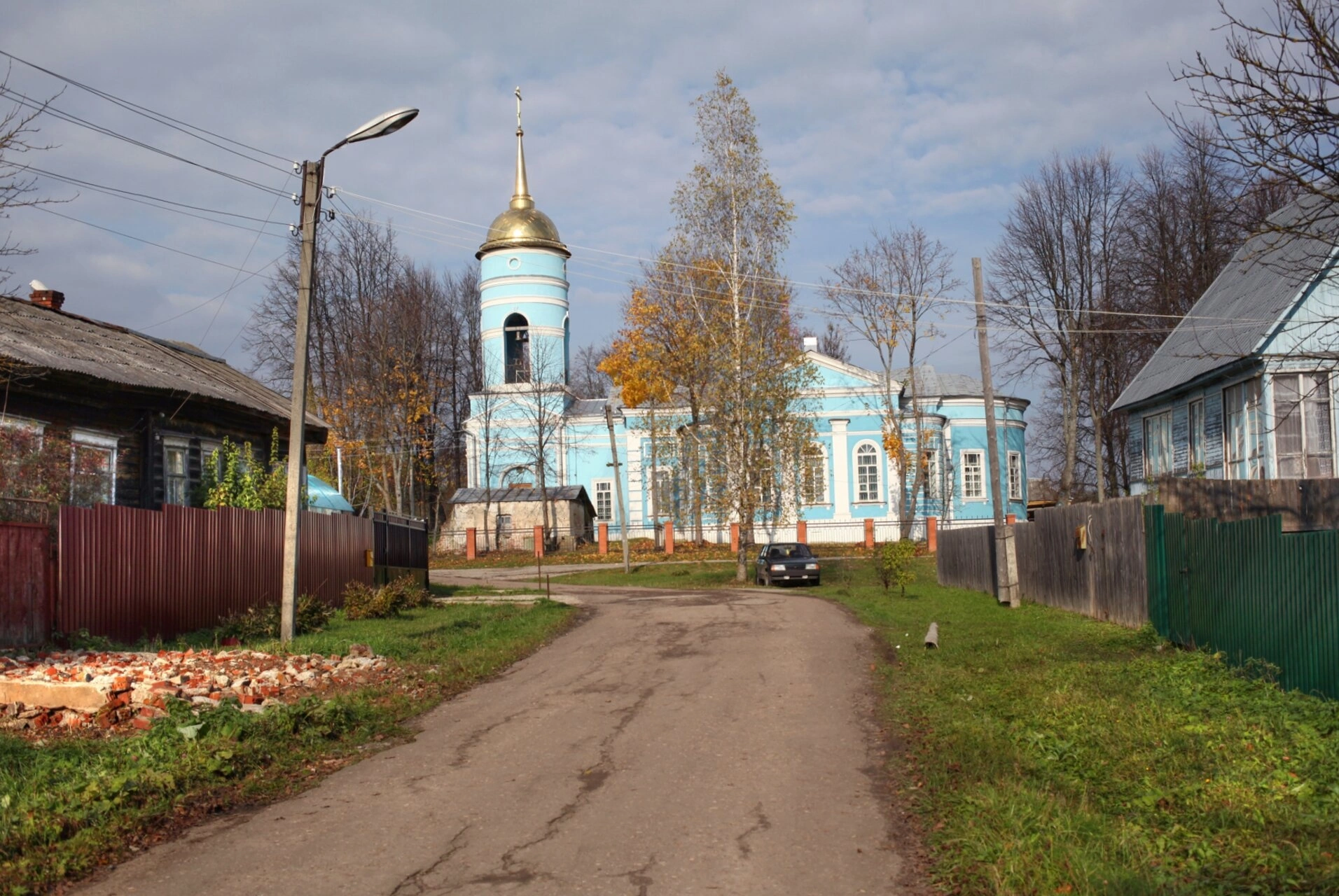 Храм гармонично вписан в окружающий сельский пейзаж. В непосредственной близости видны традиционные деревенские дома, что подчёркивает неразрывную связь православной веры с жизнью русского народа. Осенняя листва деревьев, окружающих церковь, добавляет пейзажу умиротворённое очарование и напоминает о бренности земной красоты по сравнению с вечностью горнего мира.