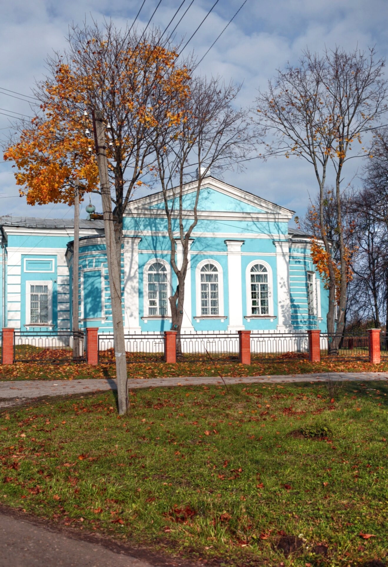 На фотографии запечатлён прекрасный осенний вид Церкви во имя Казанской иконы Божией Матери в городе Медынь Калужской области. Святыня, возведённая в стиле классицизма, предстаёт в своём умиротворяющем величии. Светло-голубые стены храма, символизирующие чистоту и небесную благодать, гармонично сочетаются с белоснежными архитектурными элементами: колоннами, наличниками арочных окон и карнизами. Фасад украшает строгий портик с треугольным фронтоном, придающий всей композиции завершённость и монументальность.