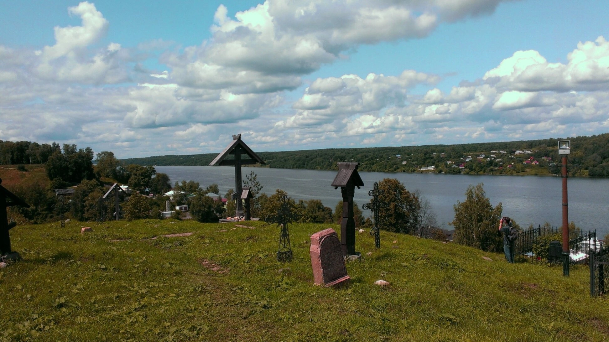 На представленной фотографии запечатлена Церковь Казанской иконы Божией Матери, расположенная на территории Петропавловского кладбища в исторической части города Плёс Ивановской области. Храм находится на возвышенности, известной как гора Левитана, что обеспечивает прекрасный обзор архитектурного сооружения.