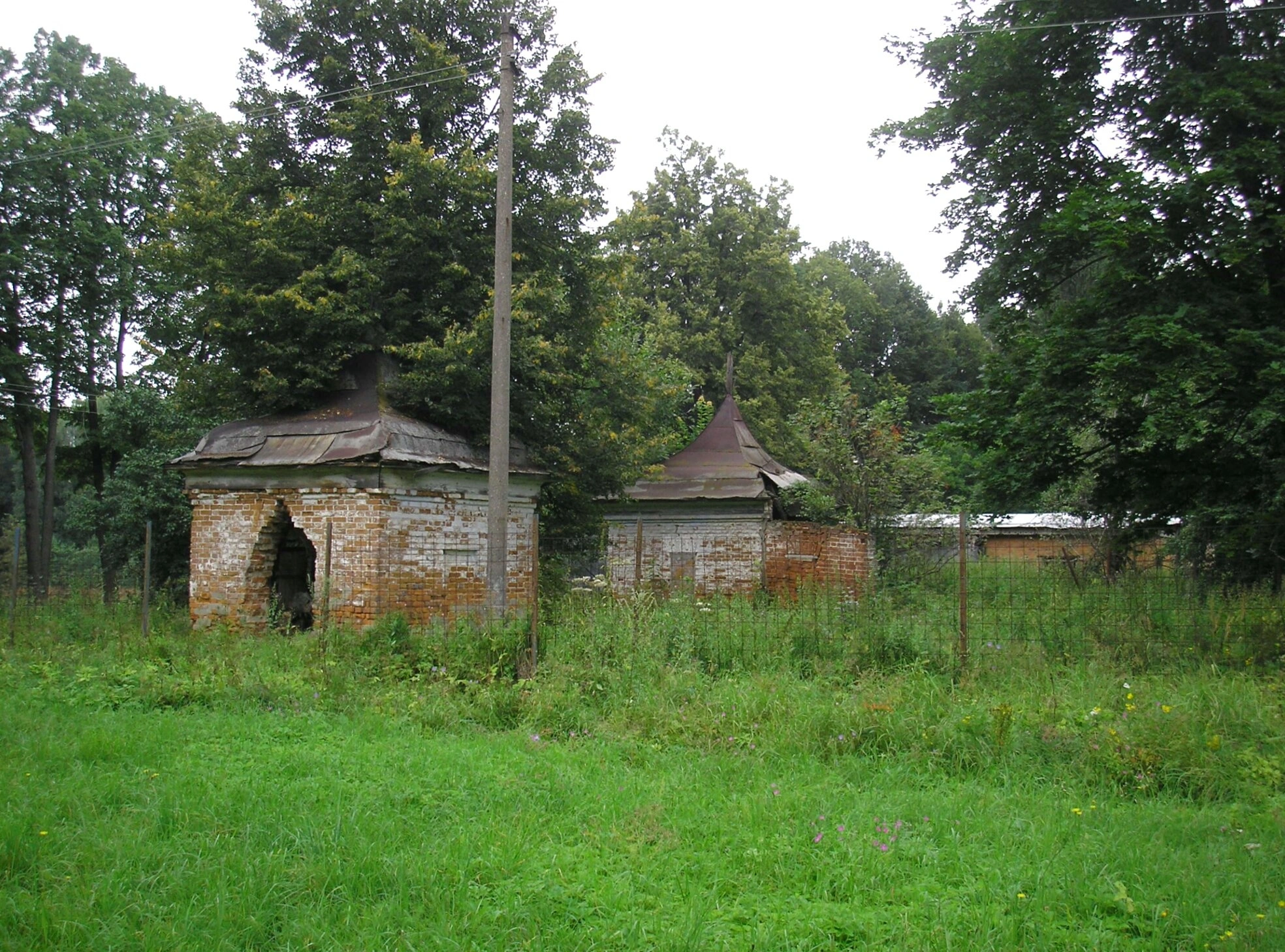 На переднем плане видны два кирпичных сооружения храмового комплекса. Кирпичная кладка демонстрирует признаки многолетнего разрушения: заметны следы выветривания, осыпающаяся штукатурка, повреждения фасада. Оба здания венчаются коническими крышами, покрытыми проржавевшим металлическим листом. Крыша левого строения имеет сложную форму, напоминающую колокол, и частично обрушена.