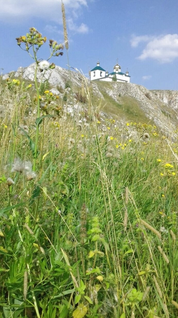На переднем плане фотографии простирается живописное поле, покрытое высокой травой и разнотравьем. Среди зелени пестреют скромные, но прекрасные в своей простоте полевые цветы: жёлтые соцветия пижмы и белые ромашки, создающие ощущение умиротворения и единения с природой. Этот естественный ковер подчёркивает благодатность места, на котором была воздвигнута святыня.