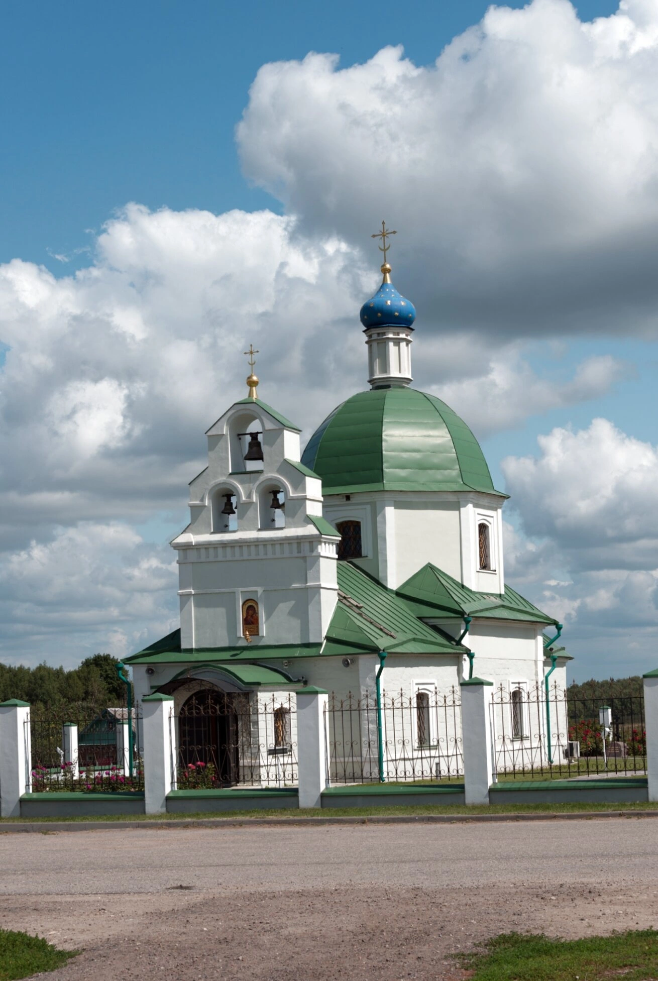 Небесная сфера на снимке представлена величественными белыми облаками на фоне лазурного неба, что придает фотографии особую духовную атмосферу. Исторические источники свидетельствуют, что церковь в Богдановке является каменным сооружением с железной крышей, окрашенной зеленой масляной краской.