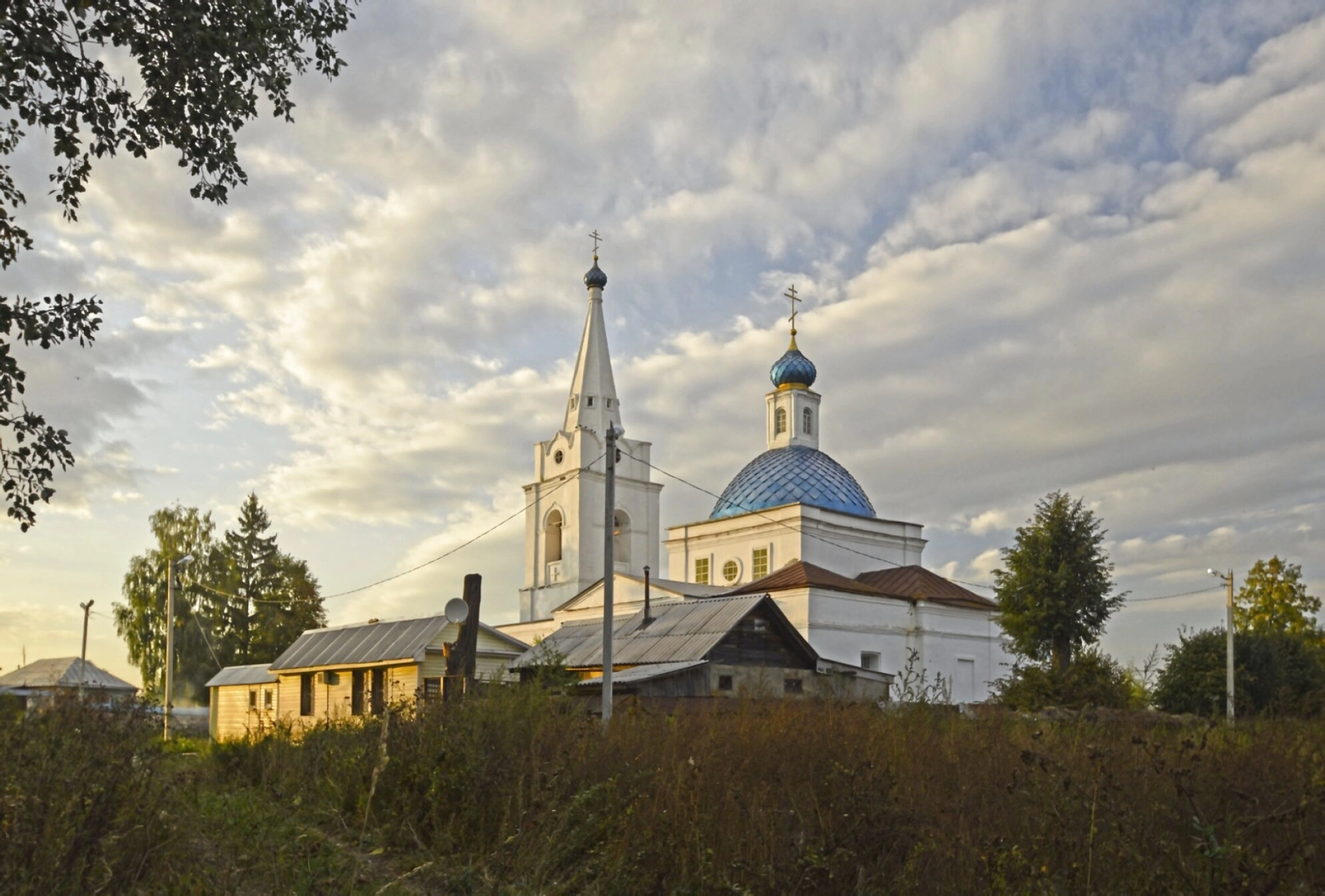 На переднем плане фотографии видны заросли луговой травы и скромные деревянные хозяйственные постройки, что подчёркивает уединённость и мирный характер этого места. Церковь окружают хвойные и лиственные деревья, создающие естественное обрамление. Снимок сделан в период так называемого «золотого часа»: мягкий, тёплый свет заходящего или восходящего солнца окрашивает белые стены храма и пышные облака в нежных золотистых тонах. Эта игра света рождает ощущение тишины, благодати и вечности, передавая подлинный духом русской сельской обители.