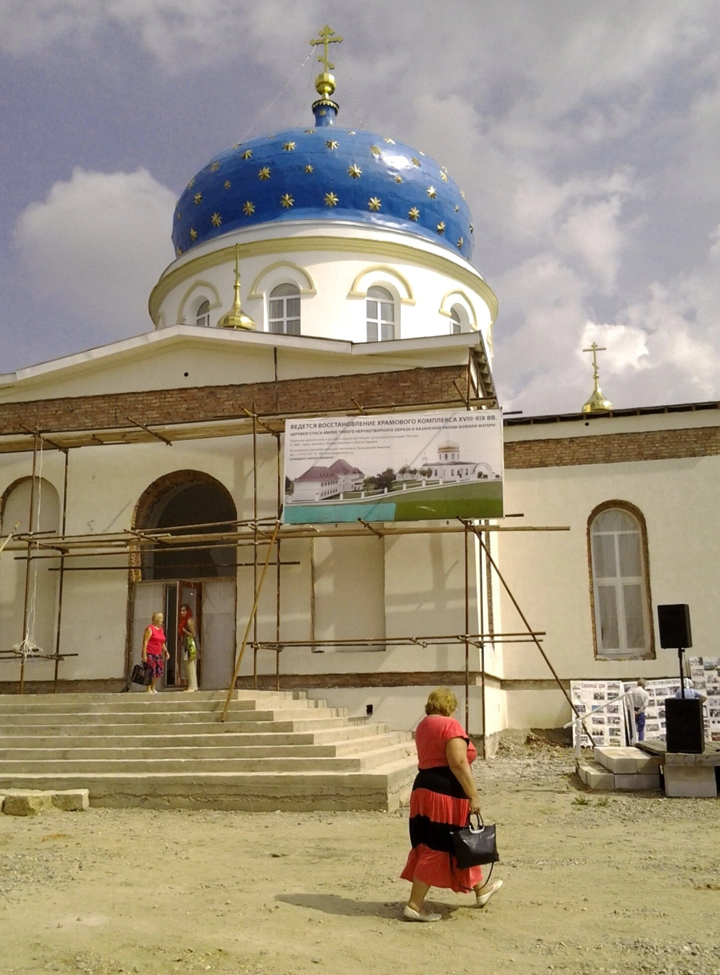 Фасад здания окружён строительными лесами, что свидетельствует о продолжающихся восстановительных работах. На стене храма размещён баннер с изображением проекта будущего восстановленного храма, позволяющий верующим и благотворителям представить конечный результат реставрации.