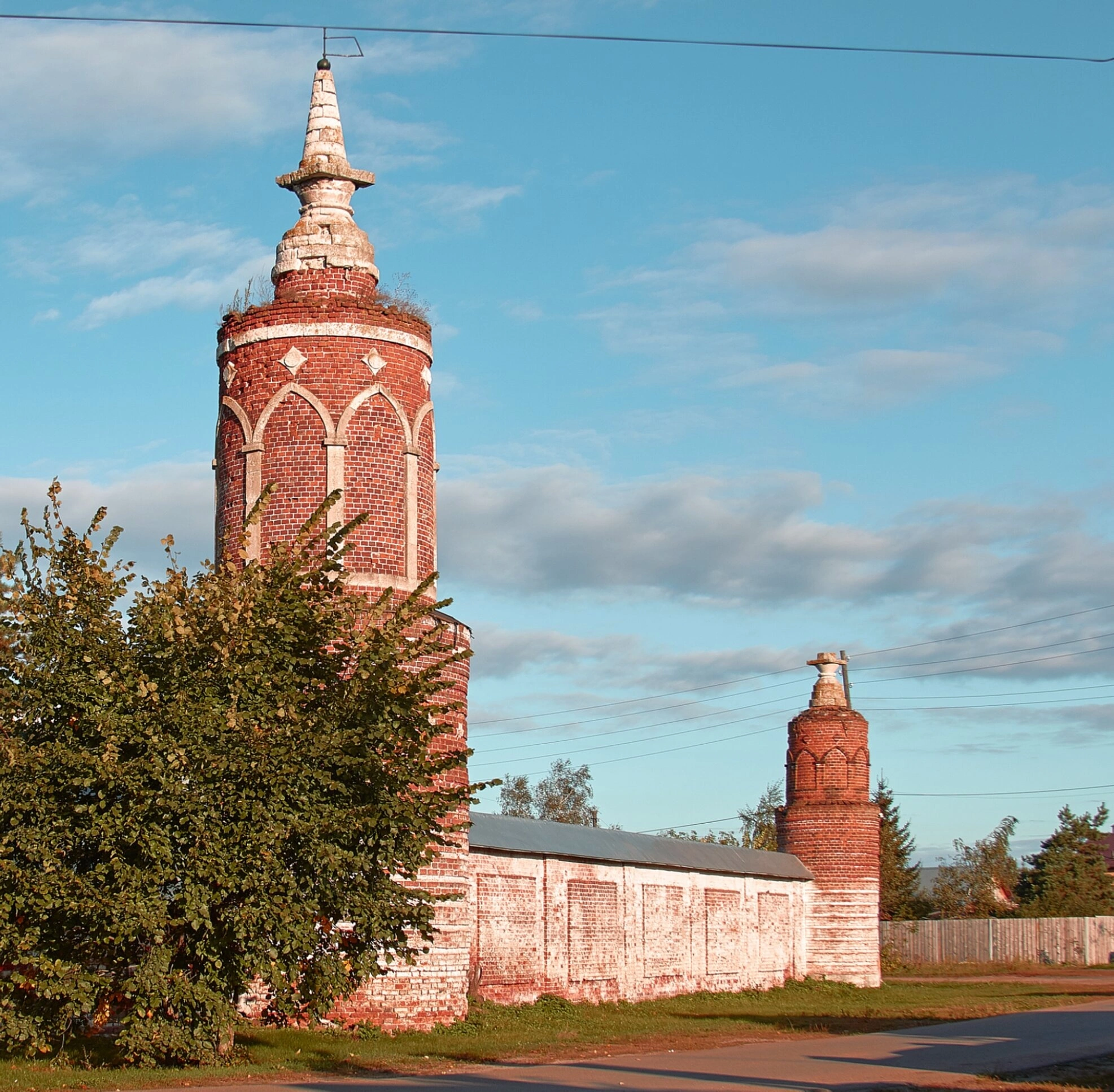 Фотография сделана в ясный солнечный день, когда голубое небо с белыми облаками создаёт прекрасный фон для тёмно-красных стен храма. Солнечный свет подчёркивает текстуру кирпичной кладки и детали архитектурного декора, усиливая восприятие исторической подлинности памятника. Дорога, ведущая к церкви, выглядит утоптанной, что говорит о том, что храм посещается верующими, несмотря на его запущенное состояние.