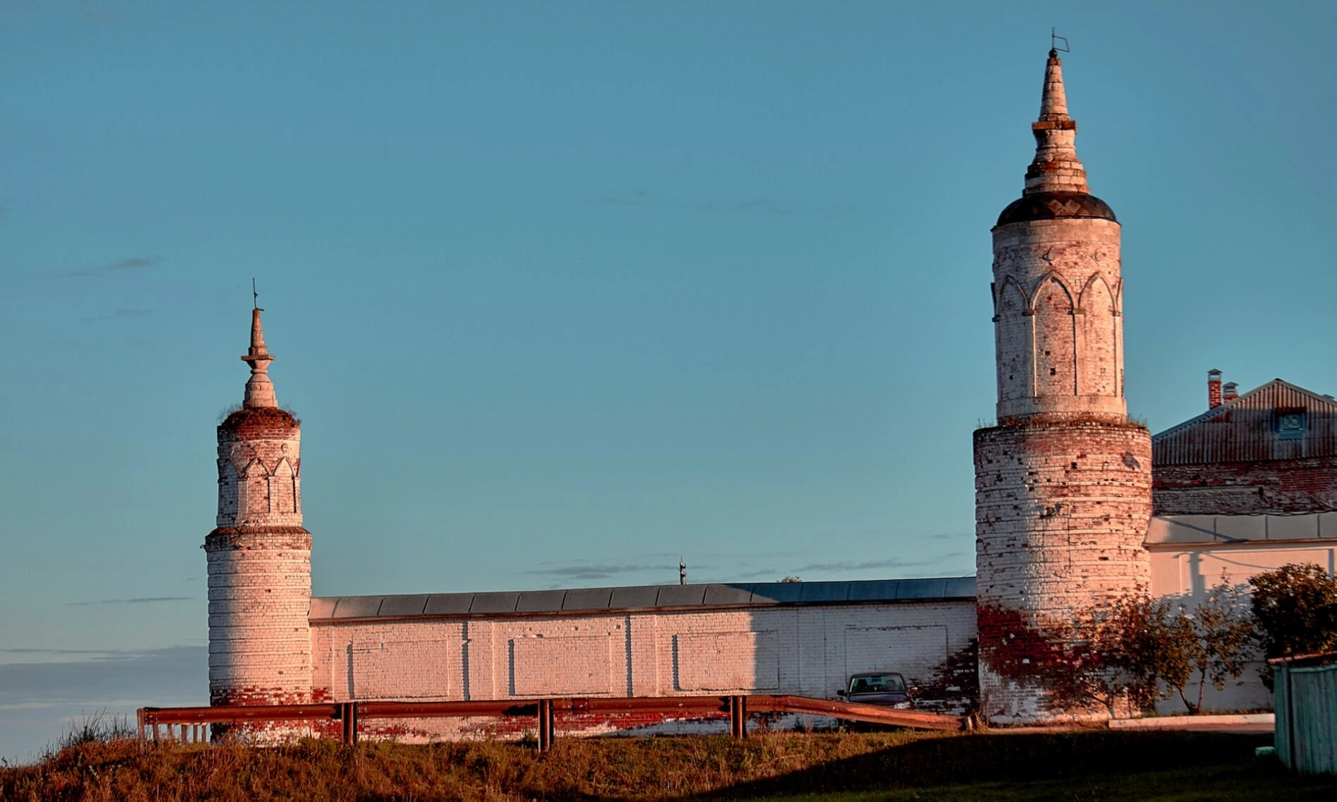 Две величественные башни, выполненные из белого кирпича, возносятся к небу своими конусообразными завершениями, увенчанными православными крестами. Благородная простота кирпичной кладки сочетается с изящными декоративными элементами, характерными для церковной архитектуры Подмосковья. Между башнями располагается одноэтажное здание храма, образующее единый архитектурный ансамбль.