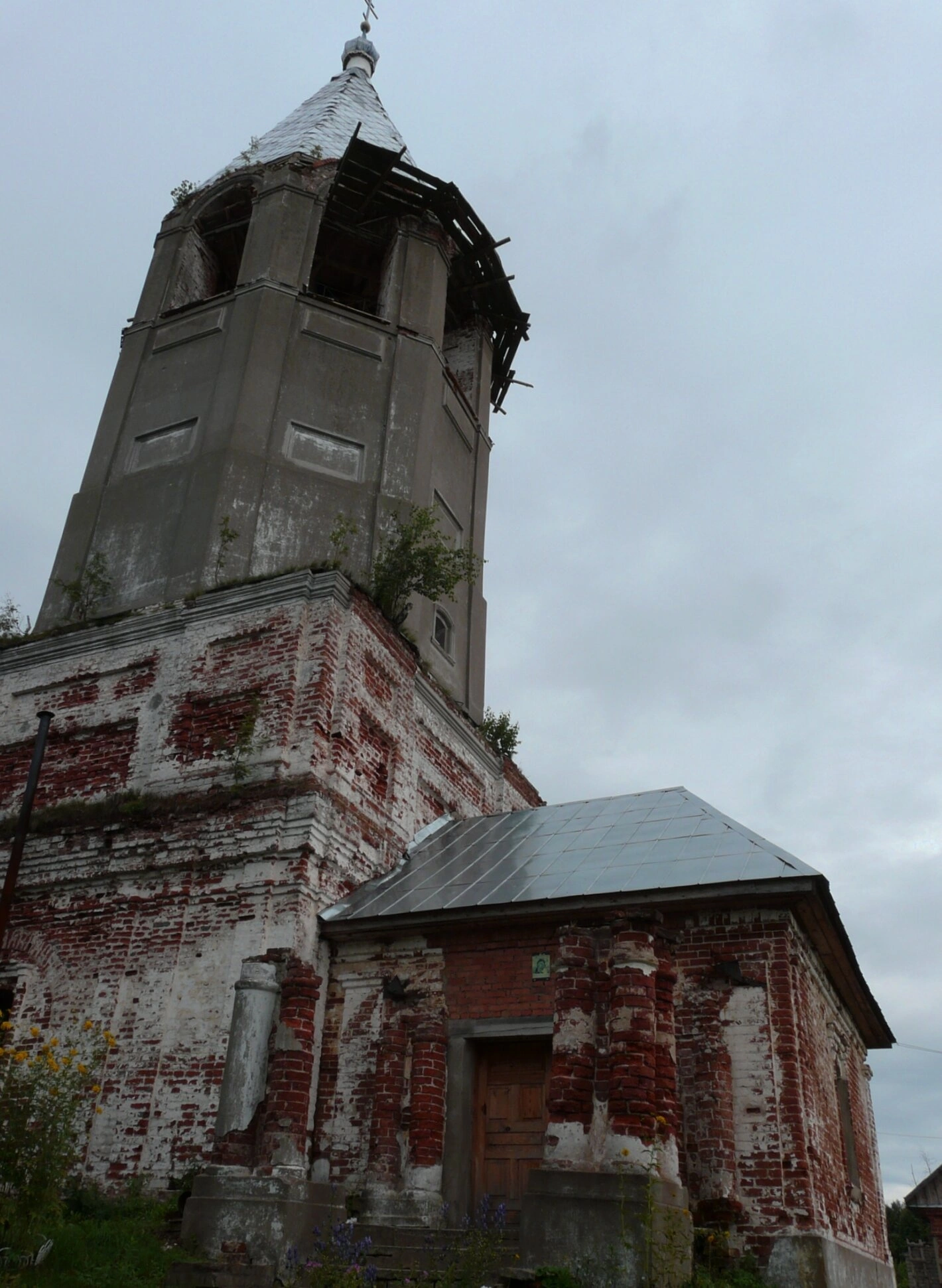 Справа к колокольне примыкает небольшой объём храмовой постройки, на котором заметна новая металлическая кровля. Эта деталь указывает на то, что храм не полностью забыт и, возможно, находятся силы, пытающиеся сохранить то, что ещё можно уберечь от окончательного разрушения.