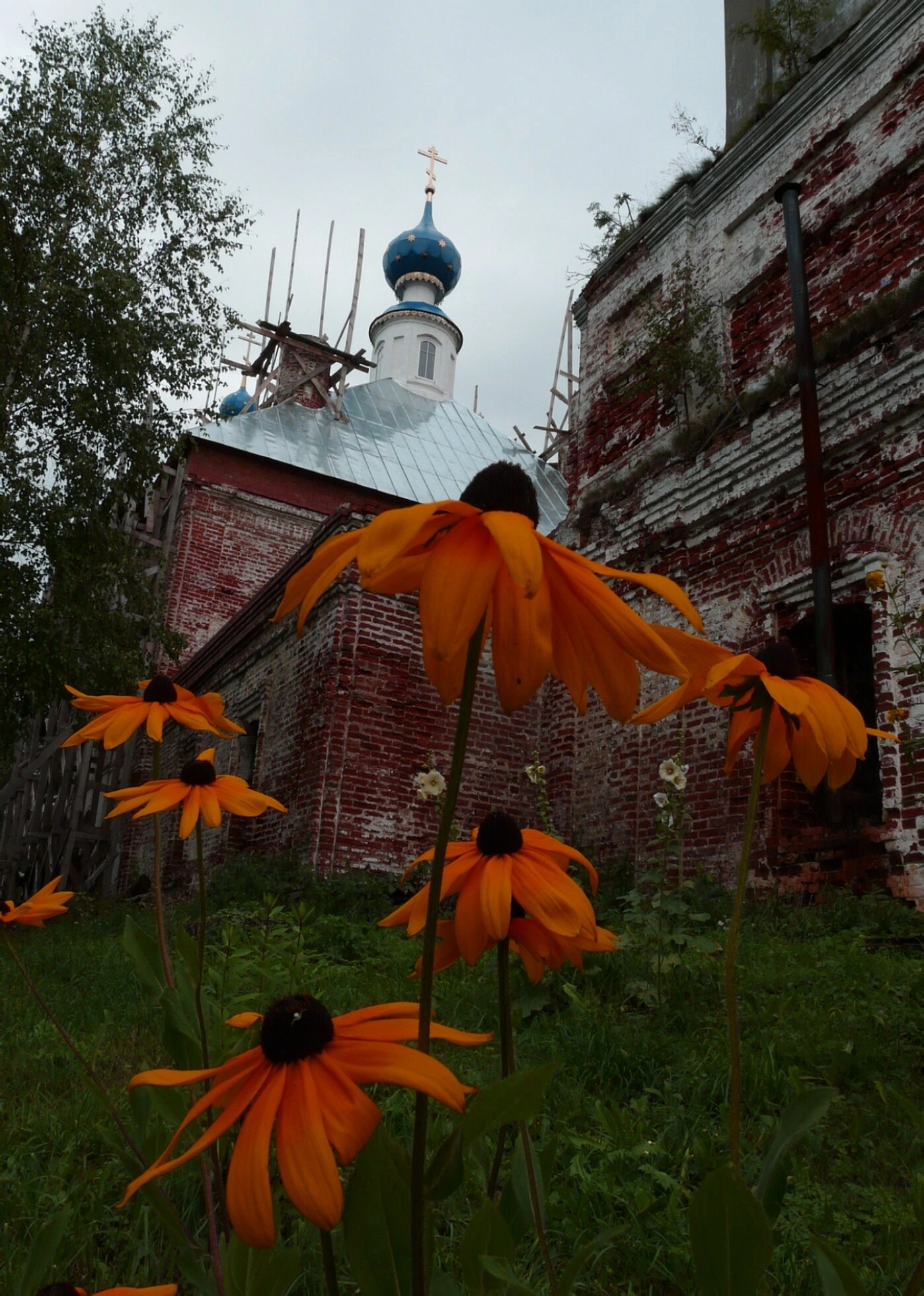 Главной архитектурной доминантой является нарядный синий купол, увенчанный золочёным крестом, который устремляется ввысь, к пасмурному небу, занимающему верхнюю часть кадра. На переднем плане фотографии, создавая яркий контраст с суровостью каменных стен, цветут жёлтые рудбекии, словно подчёркивая надежду на обновление и жизнь, продолжающуюся вопреки разрушению.