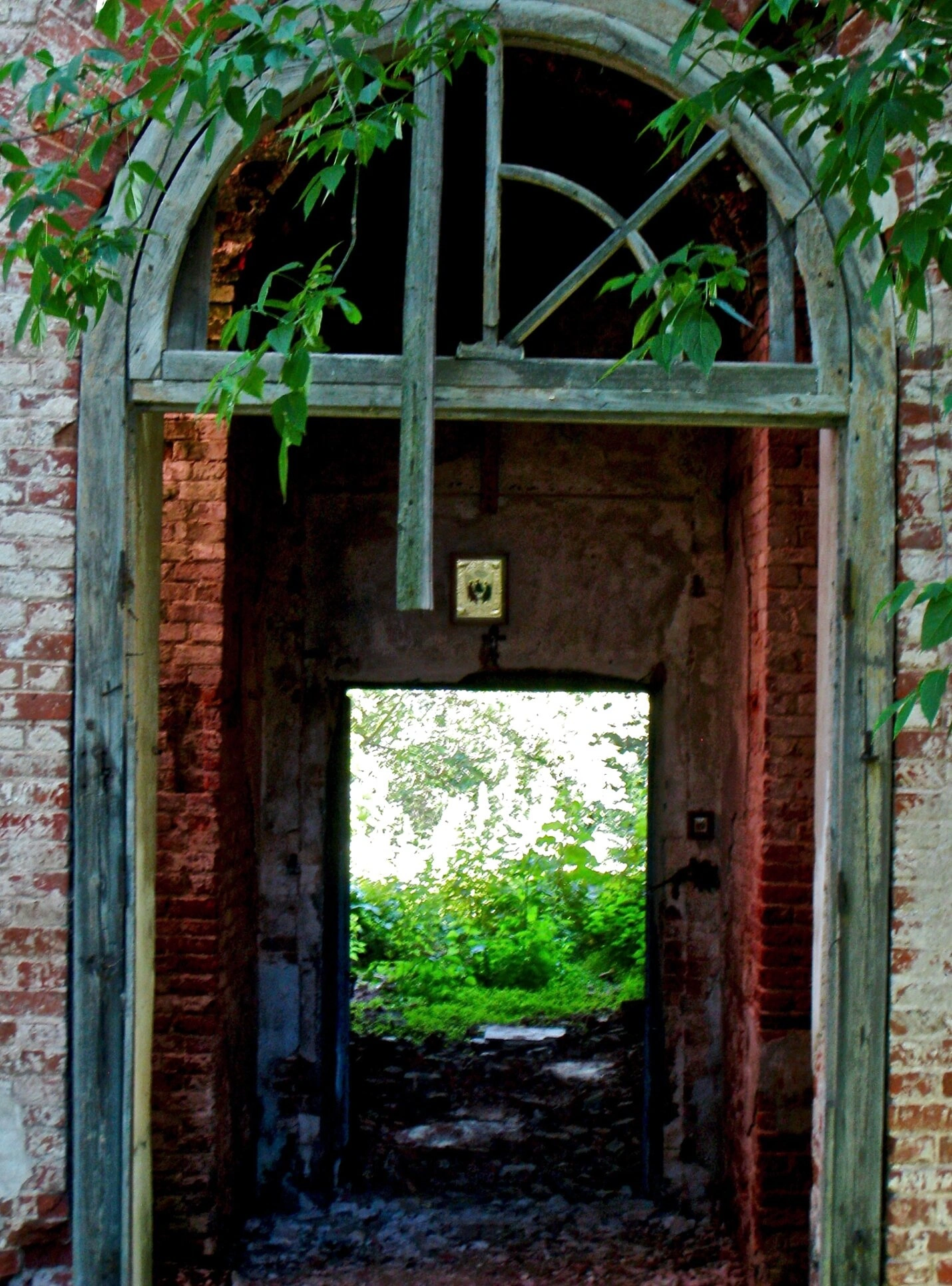 На фотографии запечатлен арочный дверной проем Церкви Казанской иконы Божией Матери, расположенной в селе Кленково Клинского района Московской области. Этот храм, возведенный в 1814 году в стиле классицизма, является памятником градостроительства и архитектуры регионального значения и имеет богатую духовную историю.
