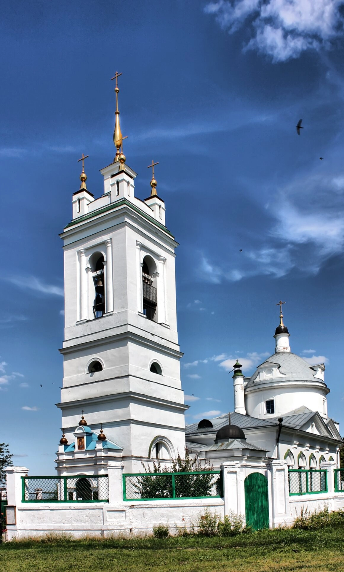 На представленной фотографии запечатлена жемчужина рязанской земли — Церковь Казанской иконы Божией Матери, что возвышается на живописном берегу реки Оки в селе Константиново. Этот белоснежный каменный храм, увенчанный златоглавыми куполами и высокой колокольней со шпилем, является не только духовным центром, но и архитектурной доминантой всего села.
