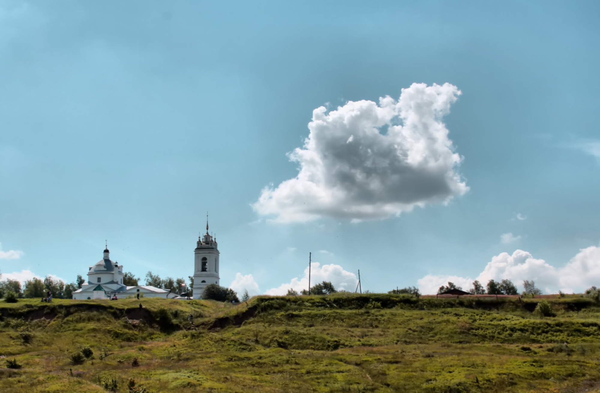 Белоснежные стены церкви и тёмные купола, увенчанные православными крестами, ярко выделяются на фоне безмятежного голубого неба с плывущими кучевыми облаками. Рядом с основным объёмом храма стоит отдельная стройная колокольня, что является характерным элементом для русской церковной архитектуры периода классицизма. Здание храма гармонично вписано в природное окружение: зелёный травянистый склон на переднем плане и кроны деревьев, обрамляющие святыню, создают ощущение умиротворения и покоя.
