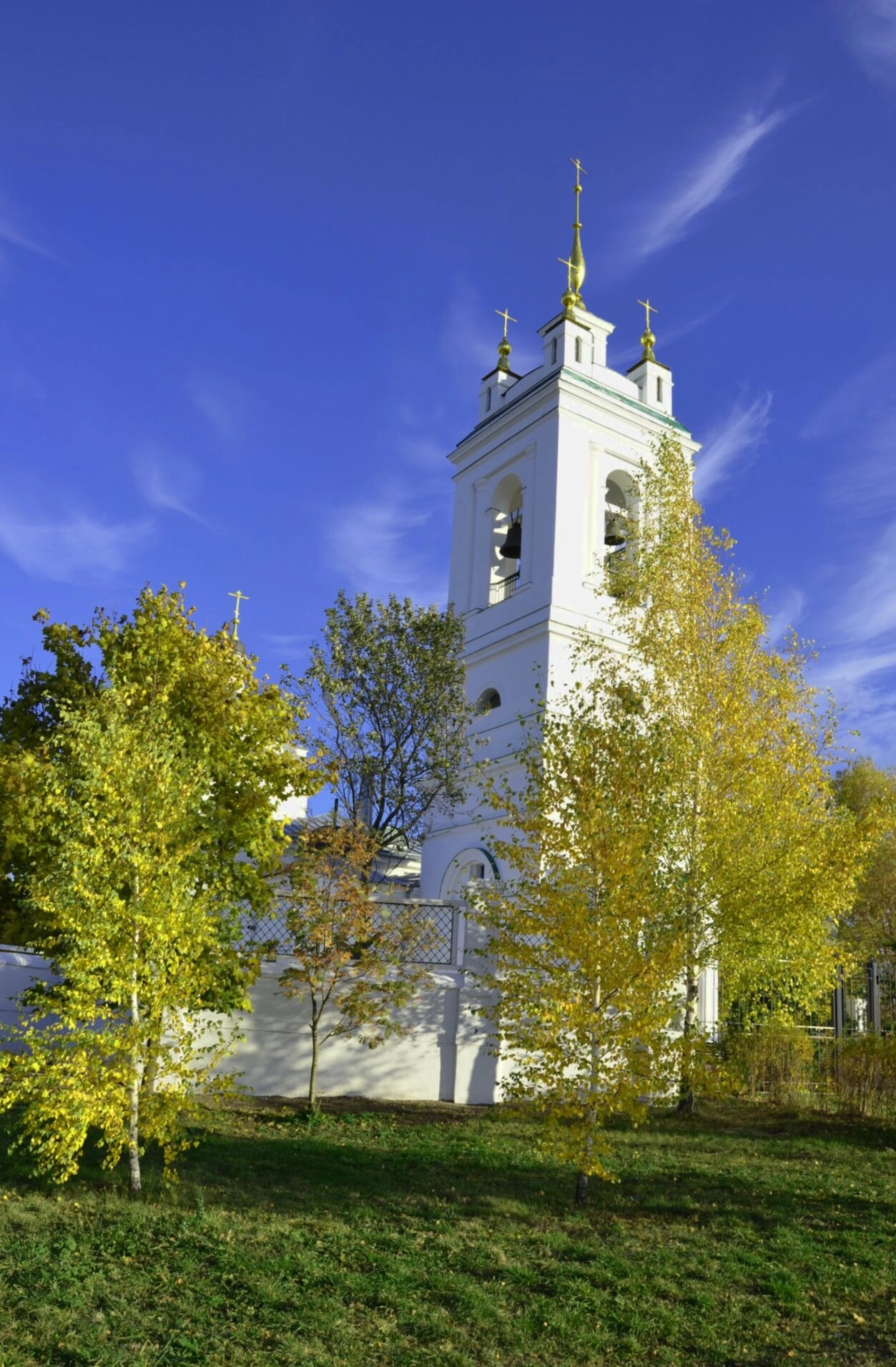 На снимке храм предстаёт в обрамлении осенней природы. Пожелтевшая листва деревьев, зелёная трава на переднем плане и чистое голубое небо с лёгкими облаками создают умиротворённую и благоговейную атмосферу, подчёркивая величие и гармонию церковной архитектуры. Церковь располагается на высоком берегу реки Оки, что добавляет пейзажу особую живописность и духовную высоту.