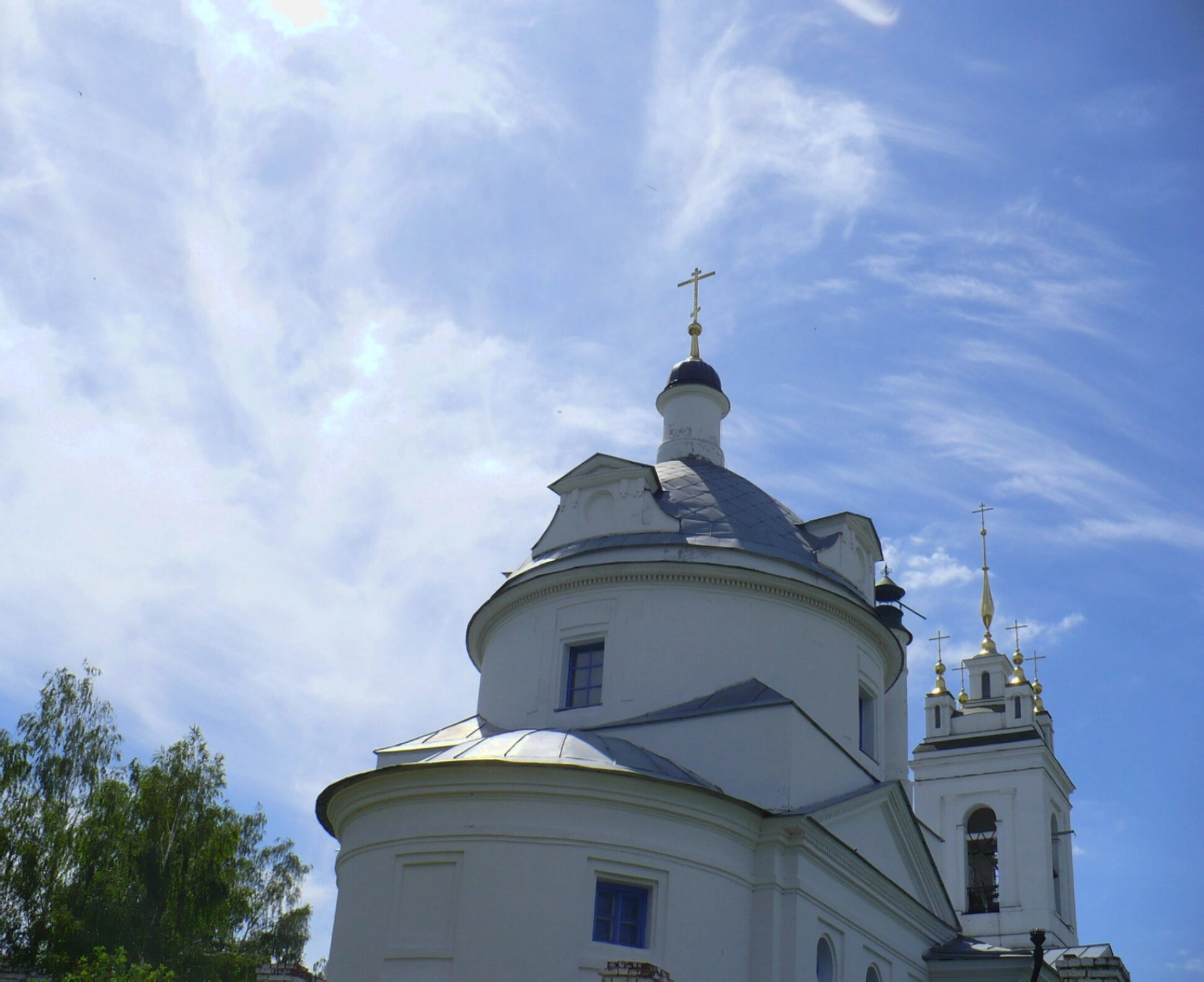 Храм, возведённый в конце XVIII века в стиле классицизм с элементами барокко, представляет собой величественное белоснежное здание с зелёными кровлями и сияющими на солнце золочёными крестами. На снимке хорошо видны центральный купол на световом барабане и изящная трёхъярусная колокольня, увенчанная небольшим шпилем. Фасад украшают арочные оконные проёмы и лаконичный декор, характерный для церковной архитектуры того периода.