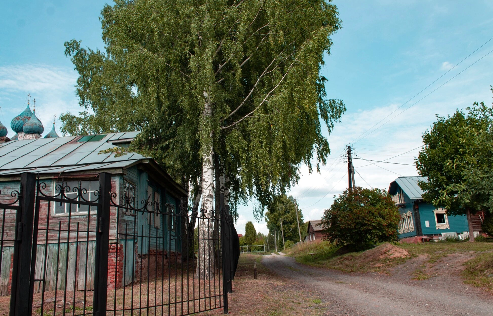 На снимке хорошо просматривается основное здание храма с характерными голубыми куполами, увенчанными православными крестами. Рядом с церковью visible старый деревянный дом, обнесённый металлическим забором, который составляет единый исторический комплекс с культовым сооружением. Фасад храма отличается строгой симметрией и сдержанным декоративным убранством, что соответствует канонам классицизма.