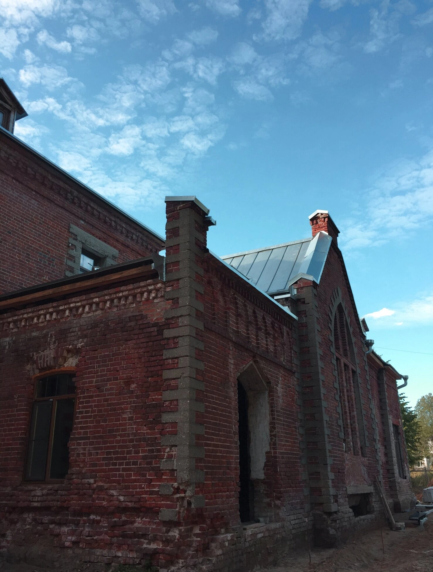 Арочные оконные проемы, некогда пропускавшие свет в молитвенное пространство, ныне частично заложены или повреждены. Особого внимания заслуживает крыша сооружения: часть кровли, вероятно над трапезной или приделом, покрыта современным металлическим листом, что создает контраст с древней кирпичной кладкой и подчеркивает сложное состояние памятника церковной архитектуры.