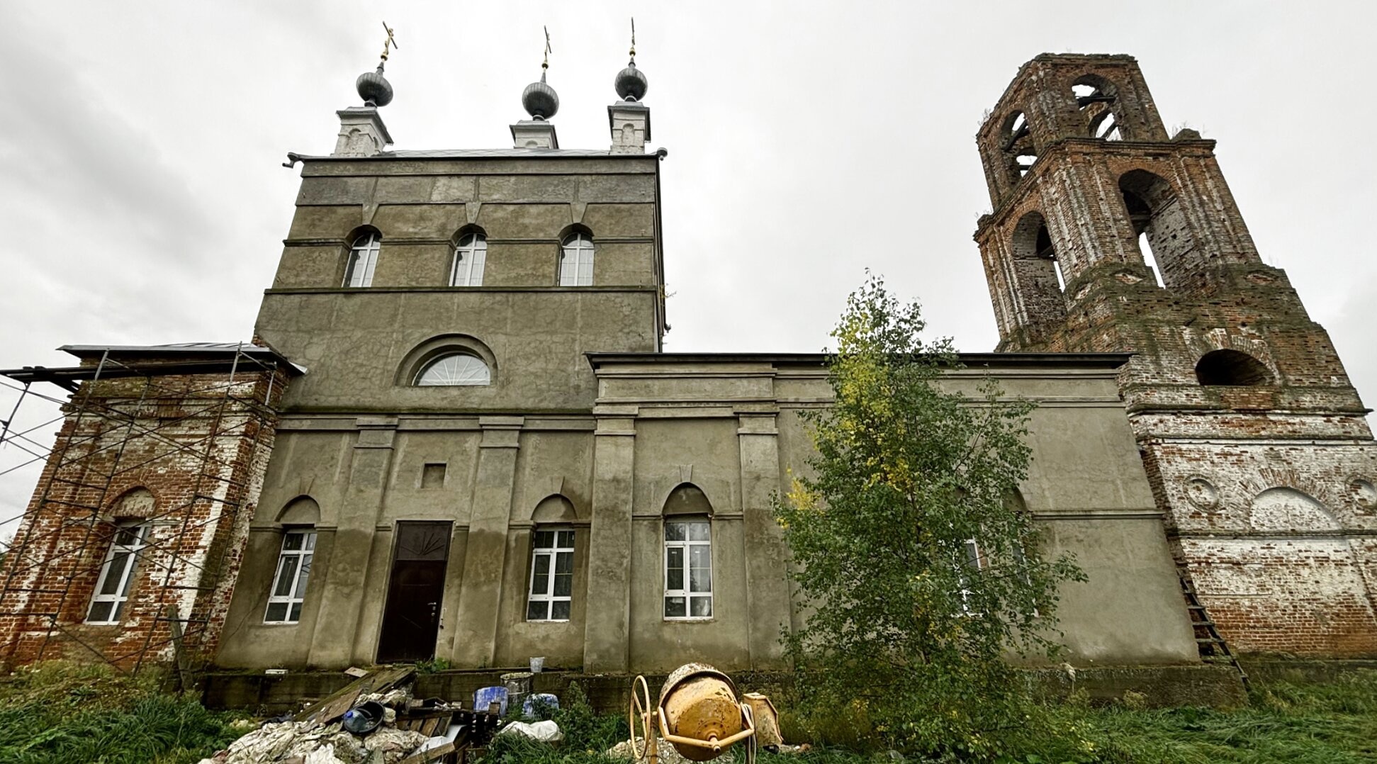 Архитектурный ансамбль включает основной четверик, увенчанный пятью главами, просторную трапезную и колокольню. К сожалению, колокольня значительно пострадала от времени и частично обрушилась. Основной объем храма выполнен из кирпича с частично сохранившейся серой штукатуркой, в то время как колокольня полностью сложена из красного кирпича без штукатурного покрытия.
