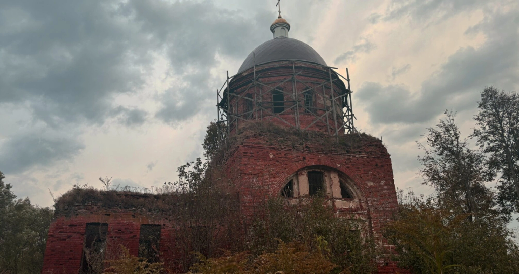 Фасад и прилегающая территория обильно поросли древесной и кустарниковой растительностью, что подчёркивает длительный период запустения святого места. Пасмурное небо с облачным покровом создаёт особую атмосферу снимка, напоминая о непростой судьбе православной святыни. Исторические источники указывают, что данный храм является объектом культурного наследия и находится под охраной государства, что объясняет начавшиеся восстановительные работы.