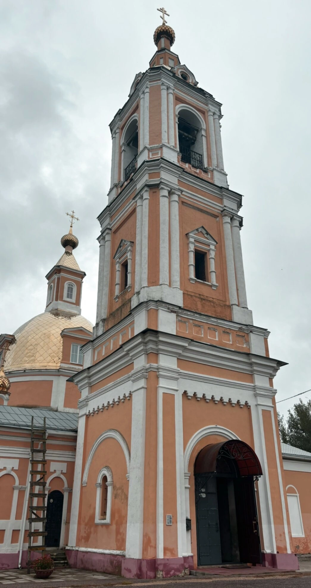 На снимке можно заметить деревянную лестницу, прислонённую к стене храма, а также кованый козырёк над входом в колокольню. Храм окружает зелёное пространство, а пасмурное небо придаёт фотографии особую атмосферу духовной сосредоточенности и умиротворения.