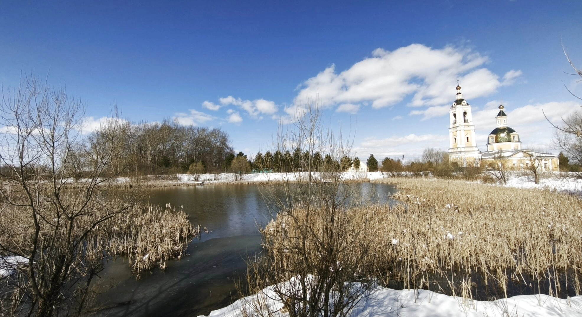 Окружающий ландшафт дополняет духовную атмосферу места. Замерзшая гладь пруда, частично покрытая льдом, обрамлена зарослями тростника и голыми ветвями прибрежных деревьев. Ясное небо с легкими облаками свидетельствует о морозном зимнем дне, когда природа пребывает в состоянии благоговейного покоя.