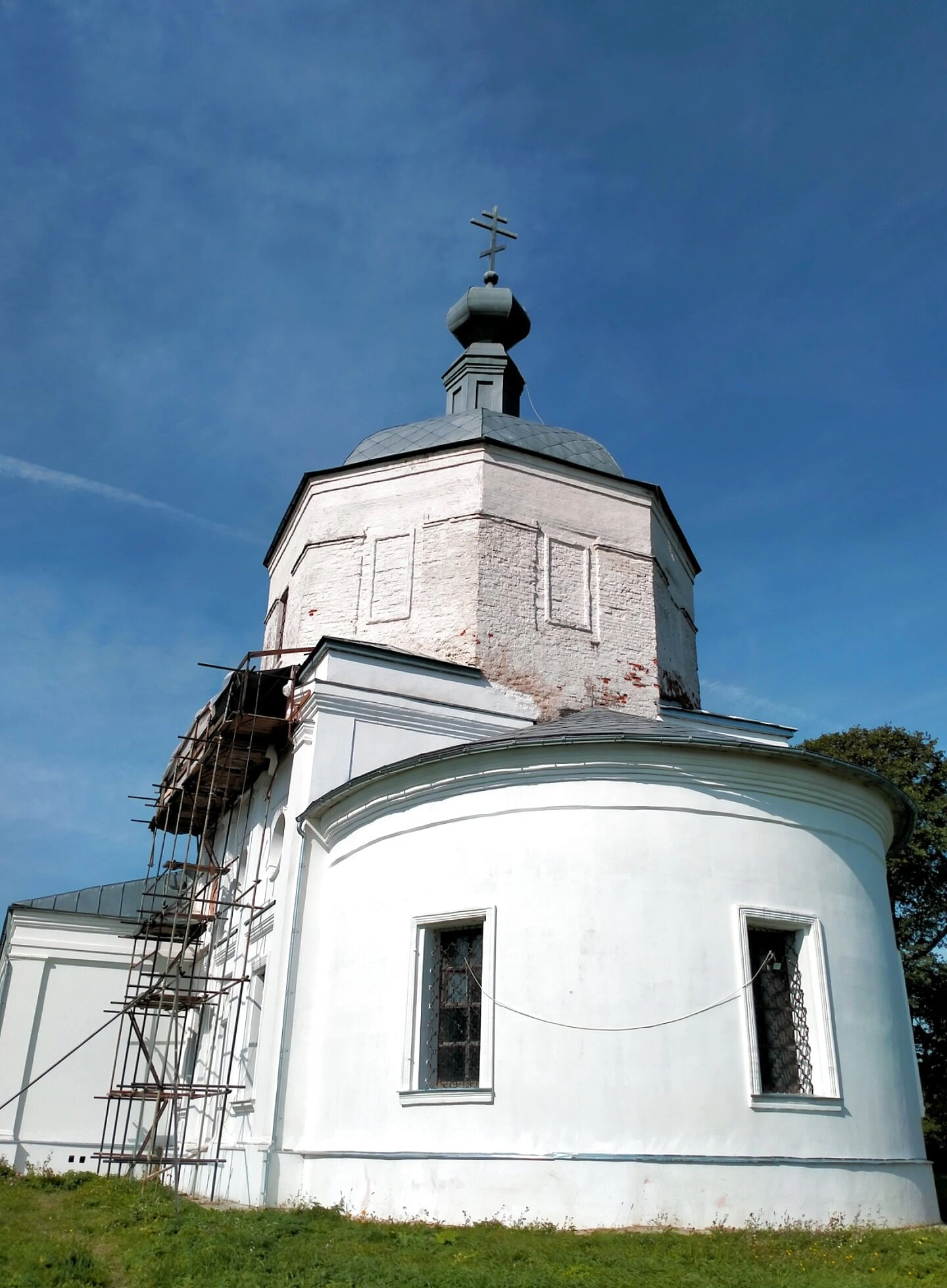 На фотографии отчетливо видно, что часть храмового комплекса, предположительно колокольня или один из приделов, находится в процессе реставрационных работ. Установленные строительные леса свидетельствуют о продолжающихся трудах по восстановлению и сохранению этой духовной святыни для будущих поколений.