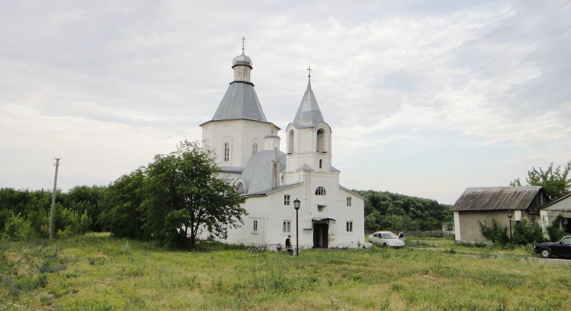 Храм располагается на открытой ухоженной территории, перед ним растёт небольшое дерево. Справа от святой обители виднеются скромные сельские постройки и припаркованные автомобили прихожан, что свидетельствует о действующем статусе церкви и её неразрывной связи с жизнью общины. На заднем плане открывается вид на зелёный лесной массив, обрамляющий храм и создающий ощущение уединённости и покоя. Небо в момент съёмки покрыто облаками, что придаёт всему образу особенную, созерцательную атмосферу.