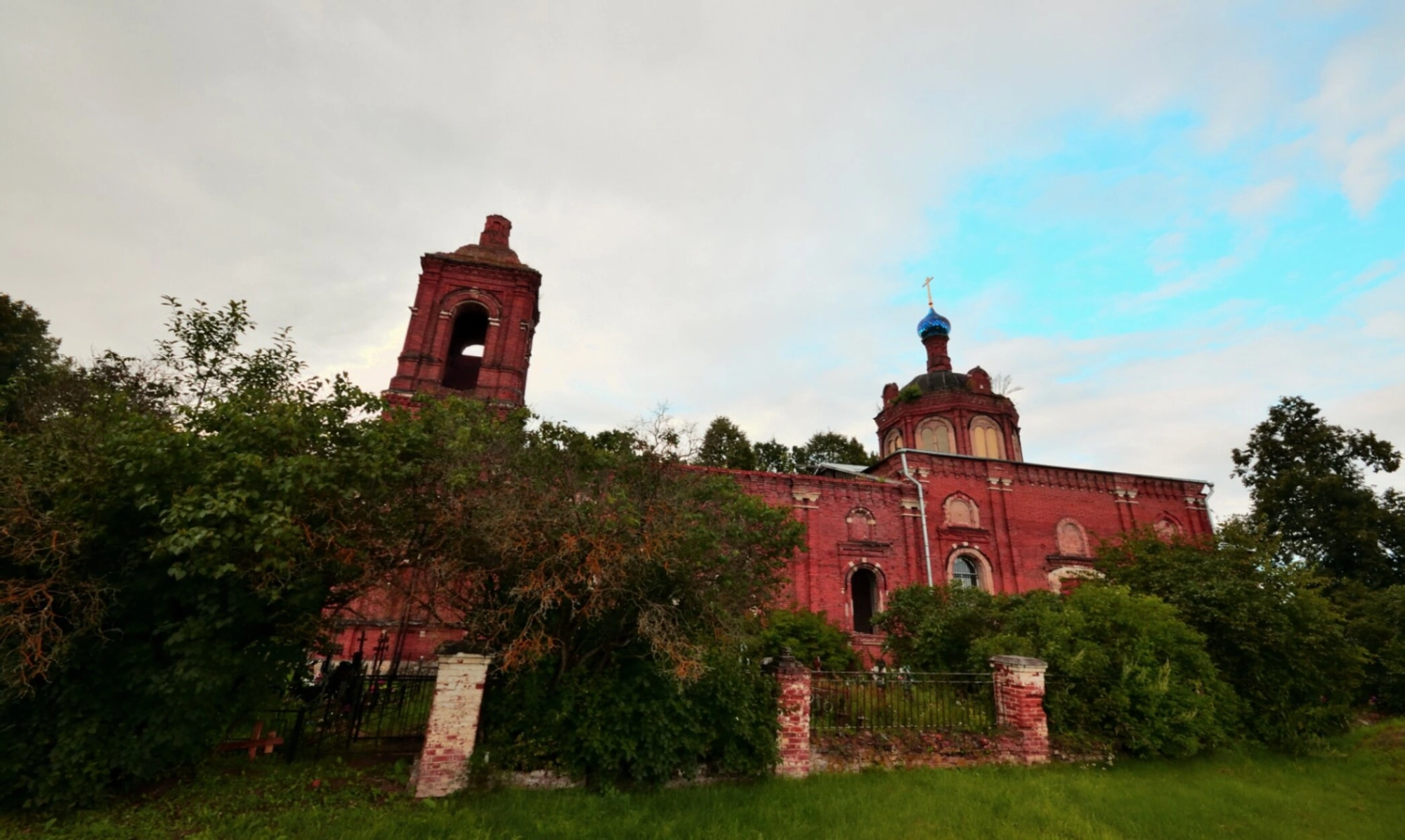 На представленной фотографии запечатлён вид на Церковь Казанской иконы Божией Матери, расположенную в селе Трёхсвятское Дмитровского городского округа Московской области. Храм, ныне пребывающий в полуразрушенном состоянии, является памятником русской церковной архитектуры конца XIX века.