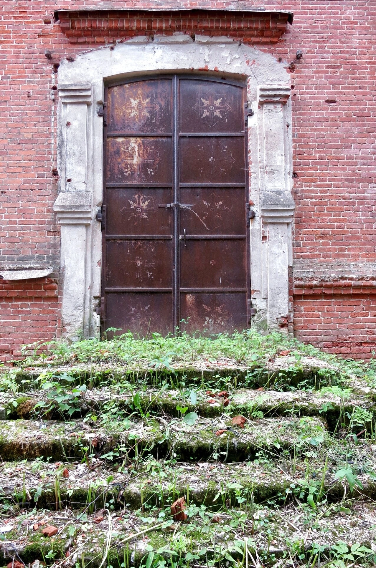 При внимательном рассмотрении на фотографии видны следы многолетнего запустения: ступени, поросшие травой и мхом, повреждения кирпичной кладки, обветшание конструкций. Эти детали напоминают о сложной истории храма, который был закрыт для богослужений в 1930-х годах и в советский период использовался как складское помещение совхоза «Рогачевский».
