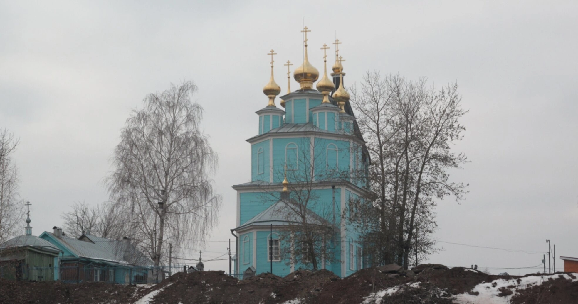 Фотография сделана в холодное время года, о чём свидетельствует отсутствие листвы на окружающих деревьях и редкие островки снега, покрывшие землю. Это придаёт архитектурному ансамблю особую, строгую красоту и чёткость линий, открывая для зрителя все детали древней конструкции. Церковь стоит на возвышенности, что подчёркивает её величие и сакральный статус в окружающем ландшафте.