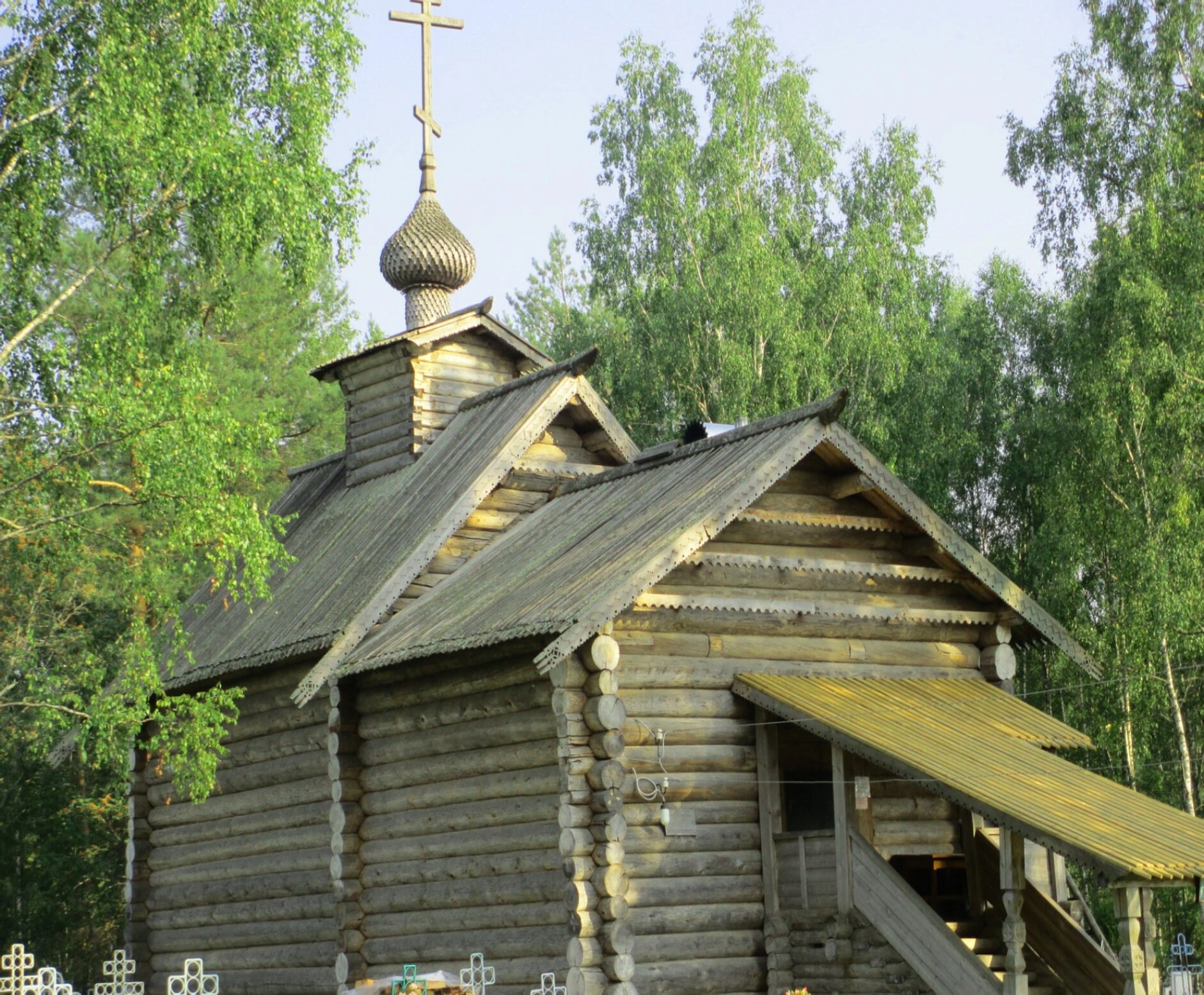 Храм располагается в умиротворённой сельской местности, окружённый берёзами и хвойными деревьями, что создаёт атмосферу благоговейной тишины и молитвенного уединения. На переднем плане фотографии видны элементы церковной ограды и надгробия, указывающие на то, что святыня находится на территории церковного кладбища — места вечного упокоения православных христиан, что подчёркивает глубокую связь храма с духовной жизнью местной общины.