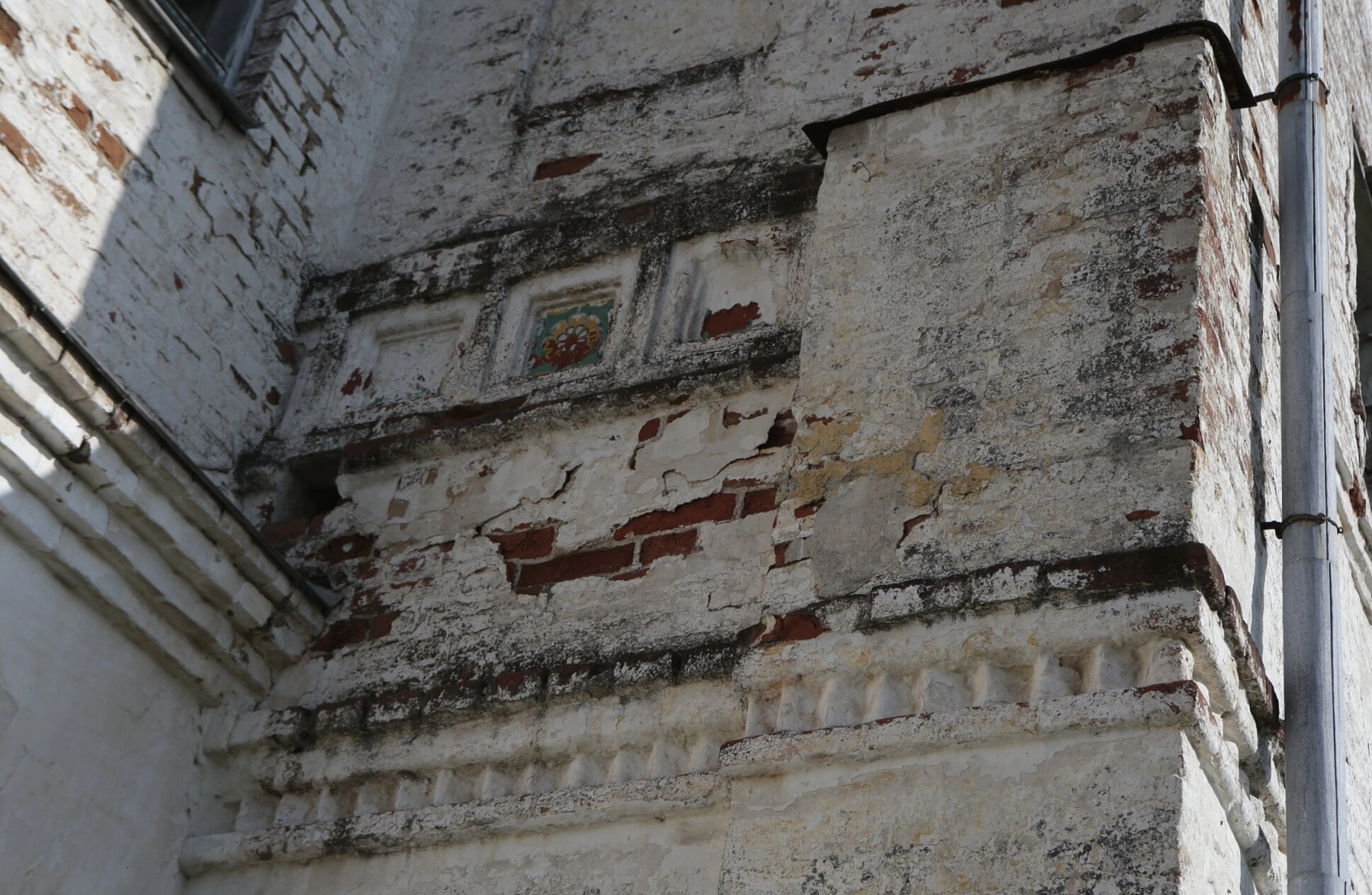 Основной композиционный акцент сделан на участок стены с признаками естественного старения материалов. Облупившийся слой белой известковой штукатурки обнажает историческую кирпичную кладку, выполненную из большемерного кирпича, что позволяет оценить конструктивные особенности постройки. В верхней части кадра сохранился фрагмент полихромного изразцового декора либо фресковой росписи, предположительно изображающий лик святого или стилизованный растительный орнамент, характерный для православного церковного искусства.