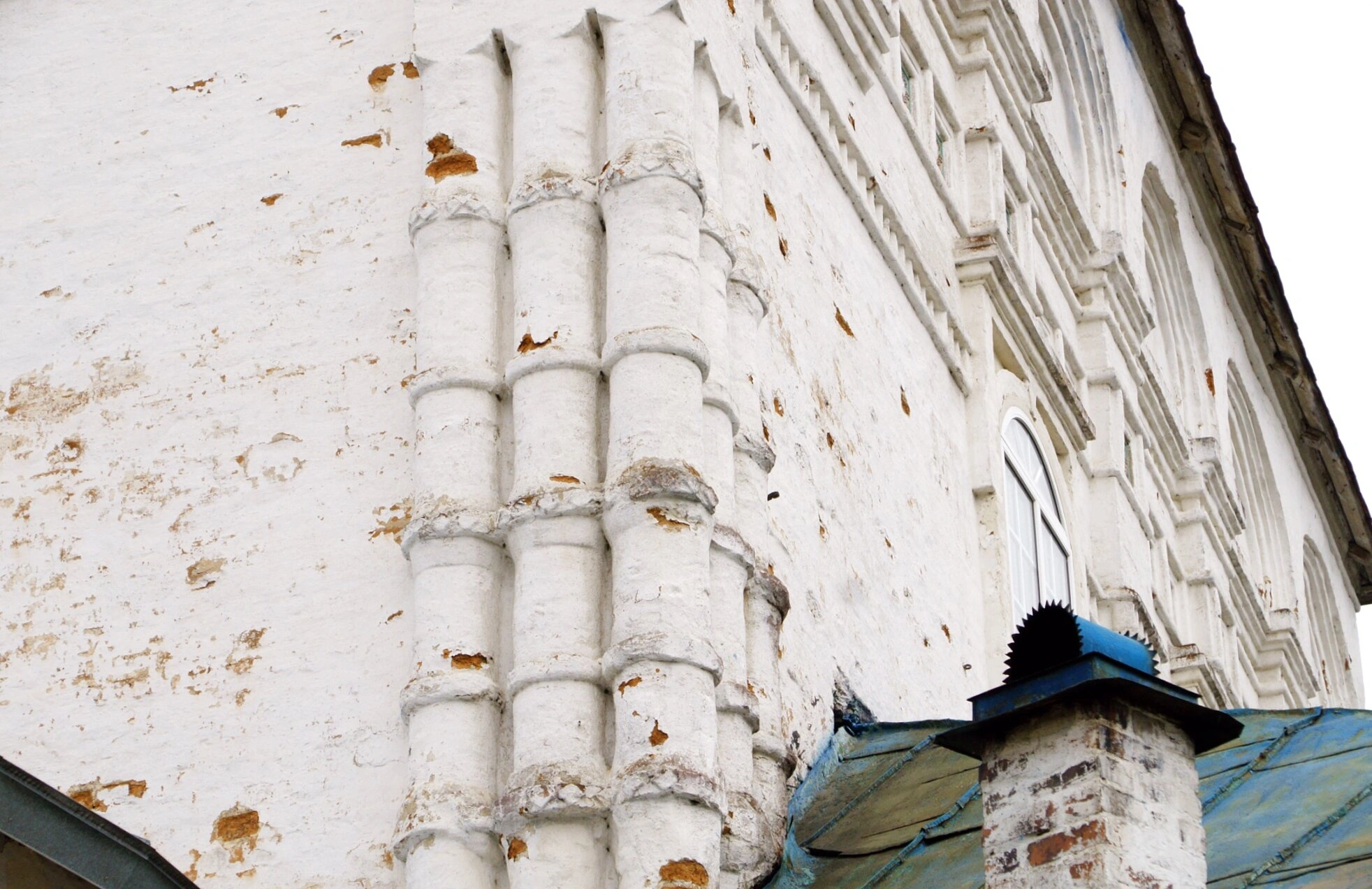 В нижней части кадра справа заметен фрагмент кровли с позеленевшим металлическим покрытием, свидетельствующий о возрасте конструкции. Кирпичная труба с синим навершием дополняет архитектурный ансамбль, напоминая о функциональном назначении храмовых построек. Текстуры старой штукатурки, облупившейся краски и древнего кирпича создают неповторимый облик святыни, хранящей память о поколениях верующих.
