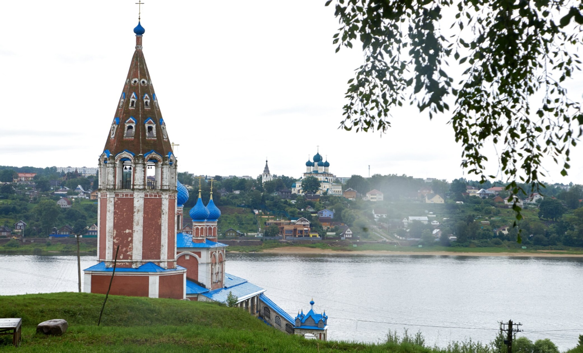 На представленной фотографии запечатлён величественный храмовый комплекс Церкви Казанской иконы Божией Матери, расположенный на живописном берегу реки Волги в городе Тутаеве Ярославской области. Этот выдающийся памятник церковной архитектуры XVII века dominates панораму Романовской стороны города.
