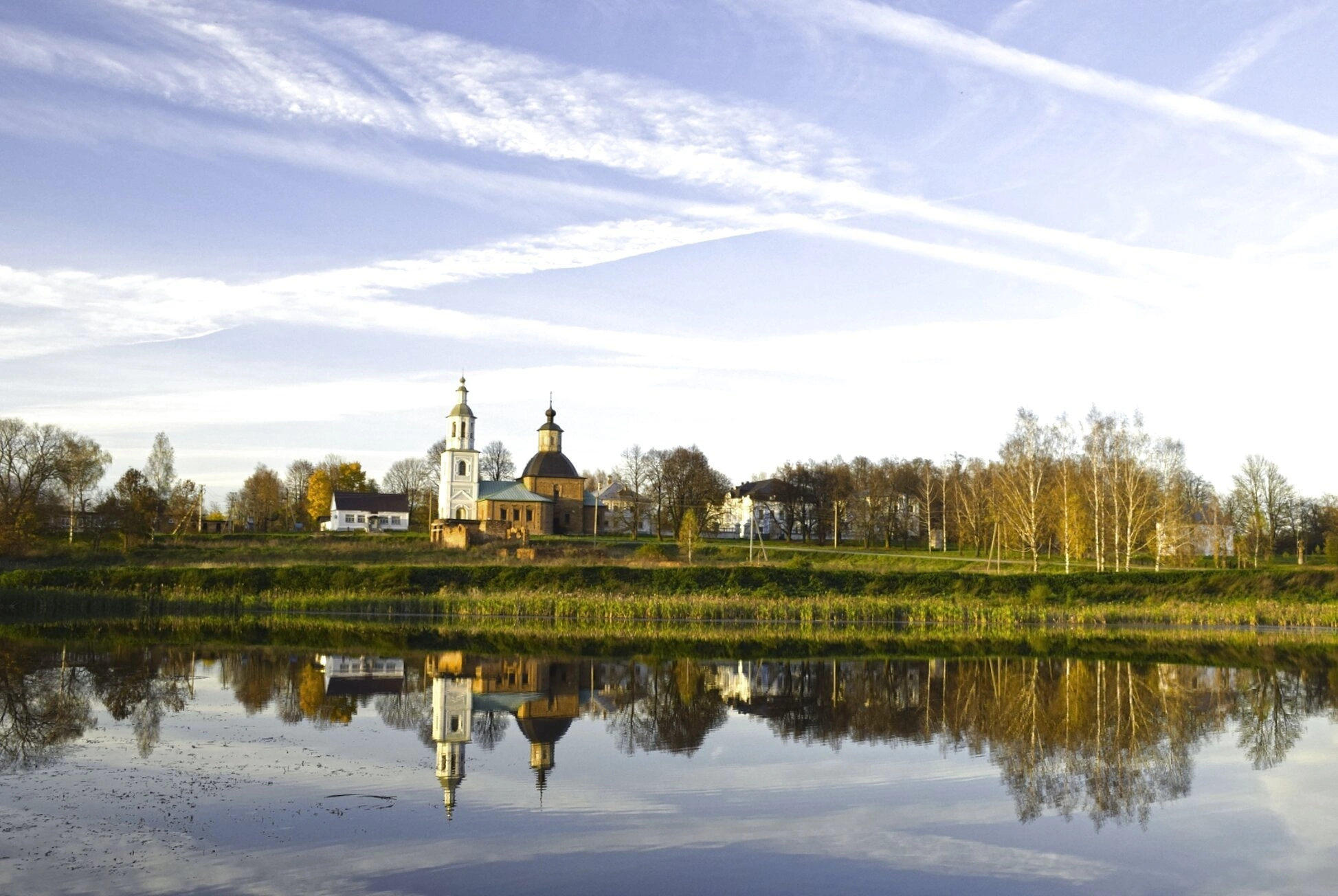 Живописность captured на фотографии композиции подчёркивается зеркальным отражением храма в глади пруда, что придаёт кадру особую духовную глубину и величие. Церковь гармонично вписана в усадебно-парковый ансамбль и является его архитектурной доминантой.