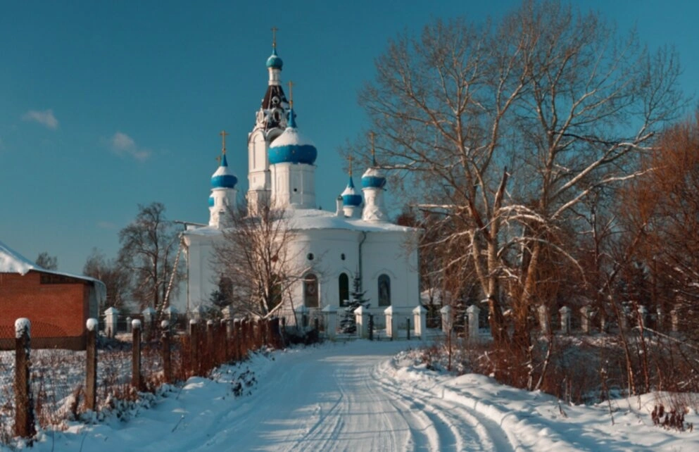 Святыня представлена в зимнем убранстве, когда земля и кровли покрыты девственным снегом, создающим особую благоговейную атмосферу. К храму ведёт расчищенная дорога с заметными следами, что свидетельствует о постоянном паломничестве верующих к этому святому месту. Деревья в церковной ограде, лишённые листвы, подчёркивают величие творения Божия в зимний период.
