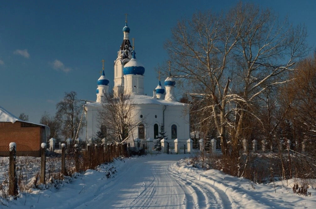 Зимний пейзаж окружает церковь белоснежным покровом, создавая атмосферу благоговейной тишины и умиротворения. Дорога, ведущая к храму, покрыта снегом, а деревья без листвы склонили свои ветви под тяжестью снежного убранства. Невысокое ограждение обозначает границы церковной территории, подчеркивая особый статус этого святого места.