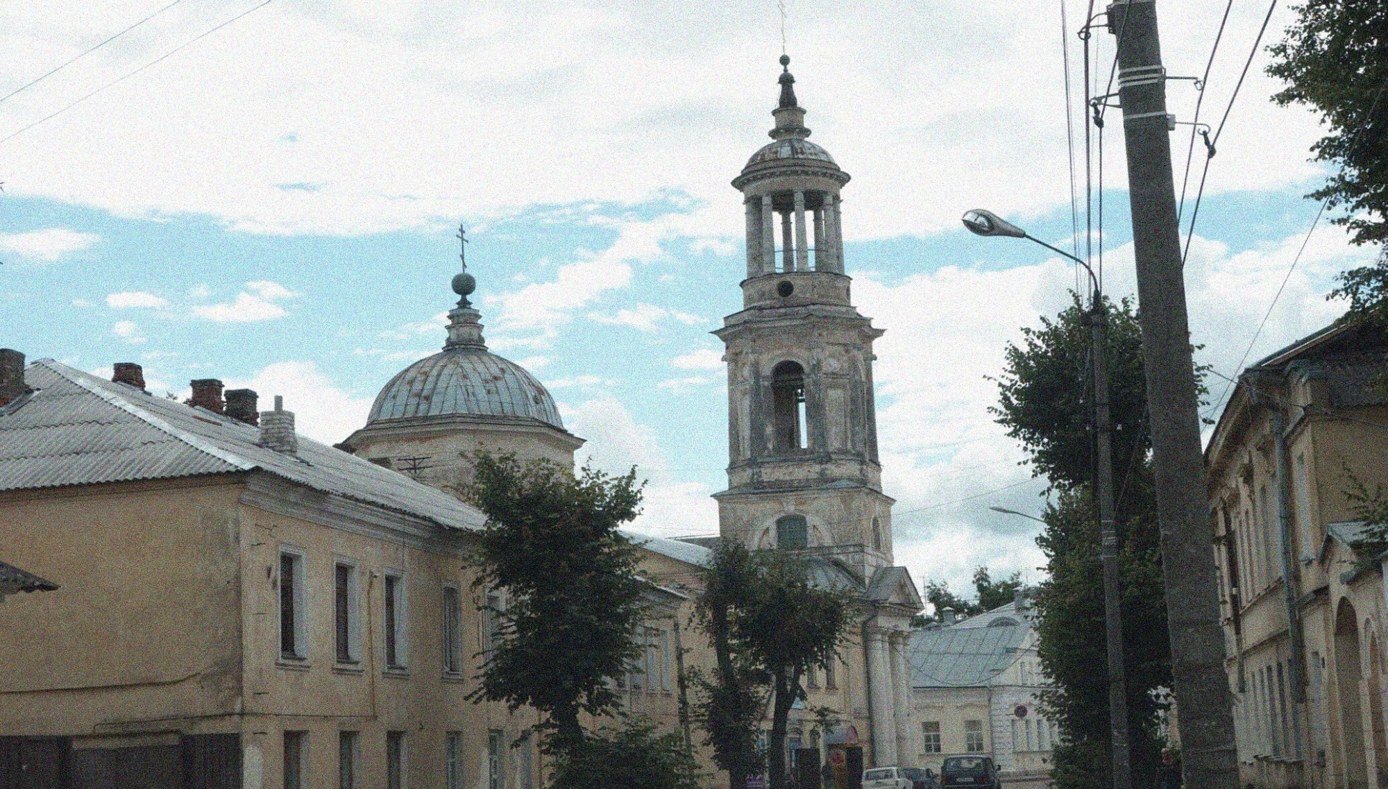 На фотографии храм окружён исторической городской застройкой, характерной для губернских городов России XIX столетия. Старинные здания, расположенные по сторонам, подчёркивают монументальность и величие церковного сооружения. Небесная сфера с облаками и зелёные насаждения придают пейзажу умиротворённость и спокойствие, свойственные провинциальному благочестию.