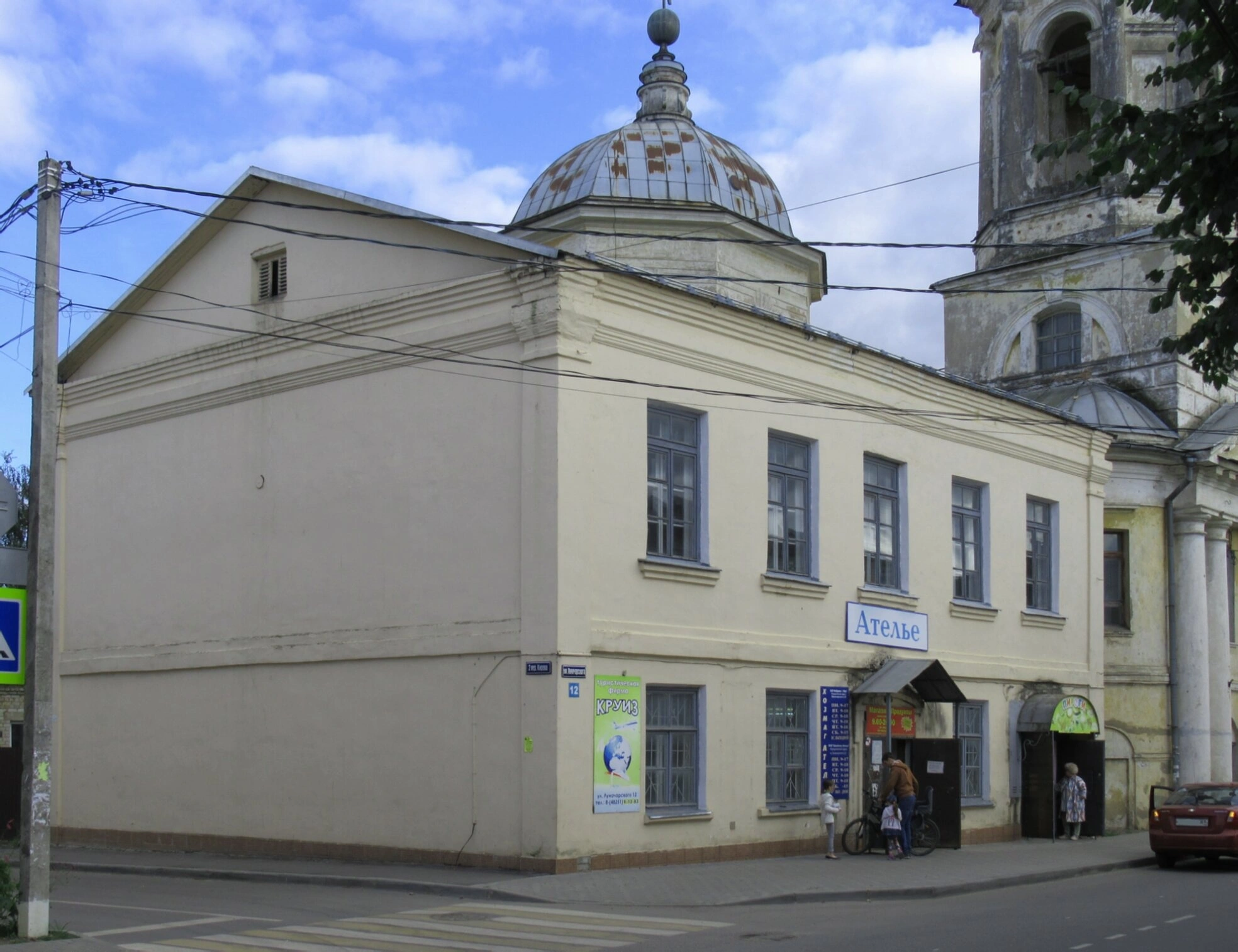 На фотографии запечатлён исторический двухэтажный дом светло-бежевого цвета, являющийся частью архитектурного комплекса церкви Климента, папы Римского, в городе Торжке Тверской области. Здание, расположенное на углу улицы Луначарского (дом 12), выполнено в классическом стиле с характерными пилястрами и карнизами. На первом этаже располагалось ателье, о чём свидетельствует историческая вывеска, а второй этаж и подклеть были отведены под домовый храм.