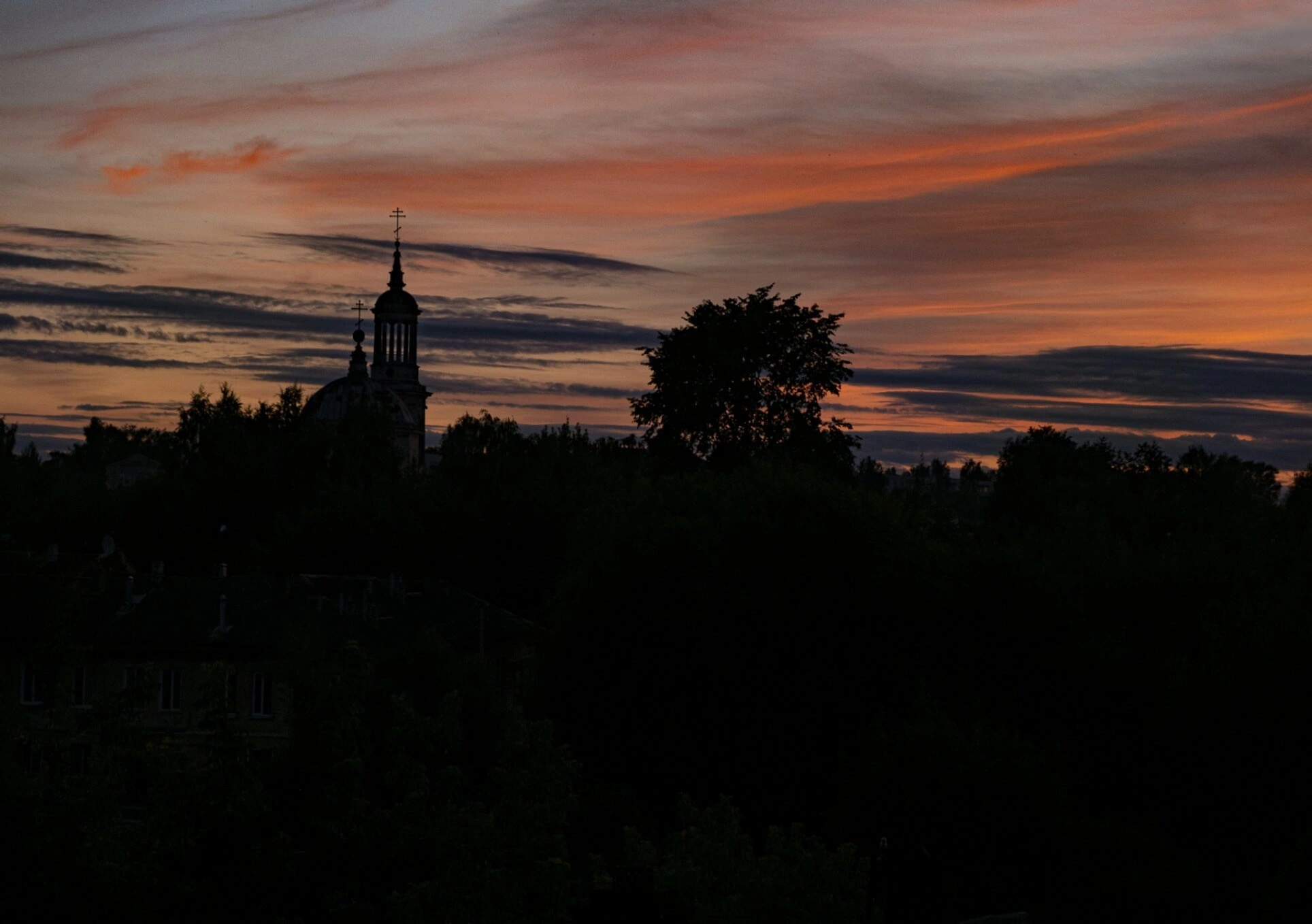 На фотографии запечатлён величественный силуэт Церкви Климента, Папы Римского, что располагается в древнем городе Торжке Тверской области. Храм, освещённый последними лучами уходящего дня, чётко вырисовывается на фоне яркого закатного неба, окрашенного в огненно-оранжевые и багряные тона. Его тёмные очертания, увенчанные традиционным куполом и устремлённым в небо крестом, создают возвышенный и умиротворяющий образ.