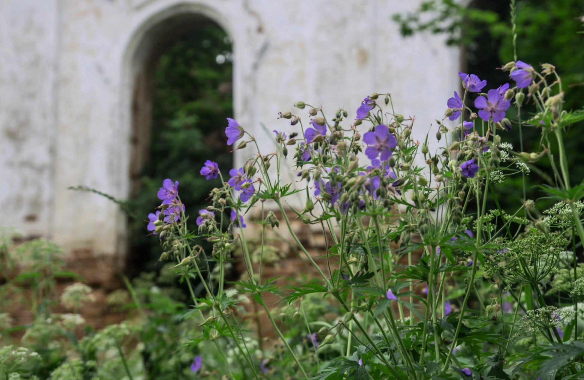 На представленной фотографии запечатлён живописный вид на Церковь Климента, расположенную в деревне Костюрино Мышкинского района Ярославской области. На переднем плане изображены цветущие фиолетовые герани, обрамляющие древние церковные стены. Их нежные соцветия создают выразительный контраст с монументальной каменной кладкой храма.