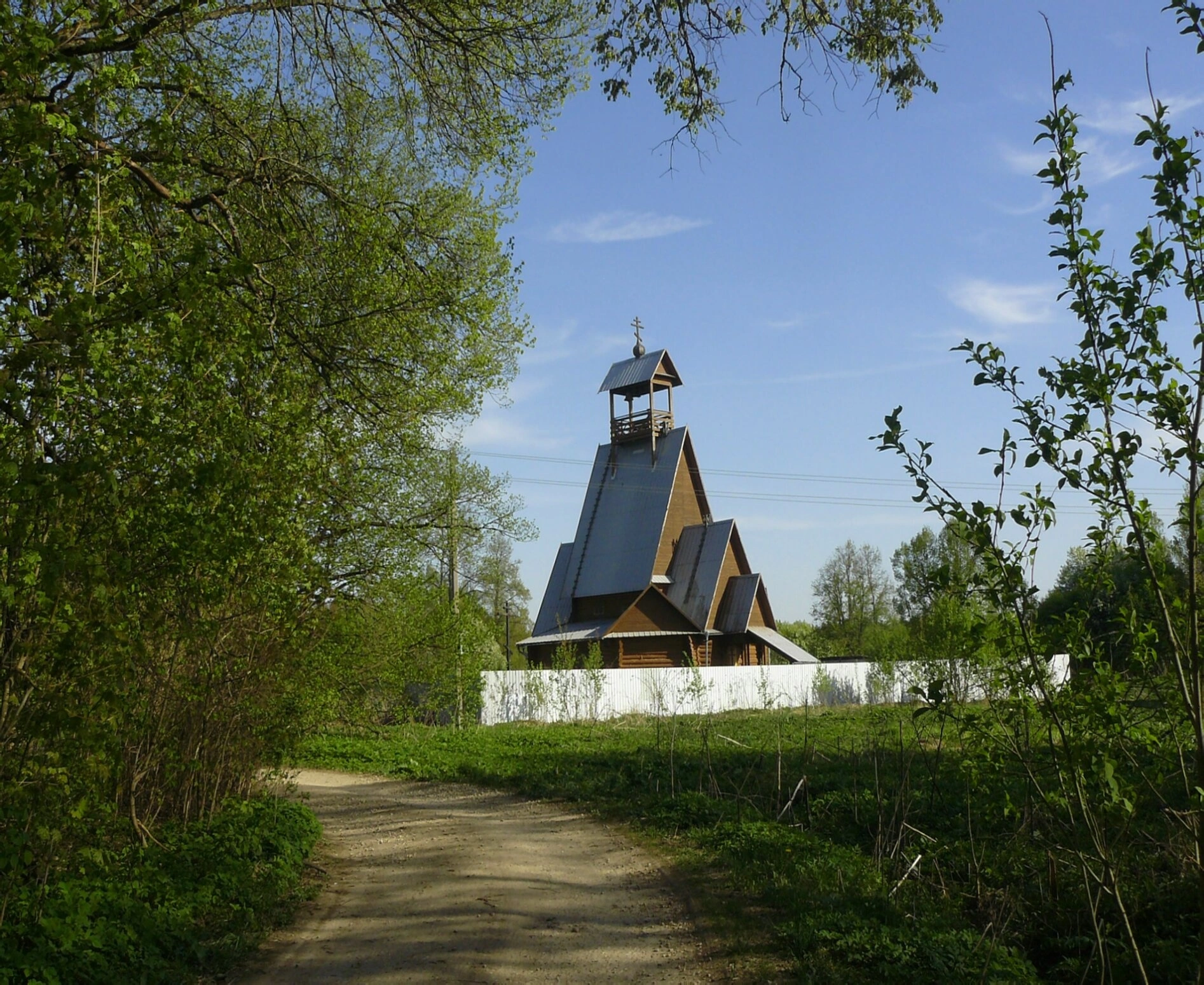Храм представляет собой традиционную русскую деревянную церковь, увенчанную стройной колокольней. Здание выполнено из дерева, что придает ему особое тепло и духовную наполненность. Сооружение окружено ухоженной территорией с зелеными насаждениями и обрамлено белым ограждением, создающим ощущение уединенности и благоговейной тишины.