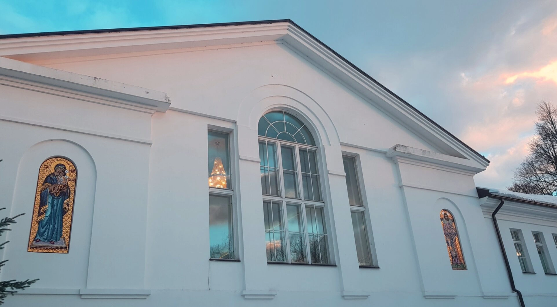 На фотографии запечатлена Церковь в честь Корсунской иконы Божией Матери, являющаяся частью архитектурного ансамбля Свято-Никольского Черноостровского монастыря в городе Малоярославце. Белоснежный храм, украшенный мозаичными образами святых, представляет собой памятник церковной архитектуры федерального значения.