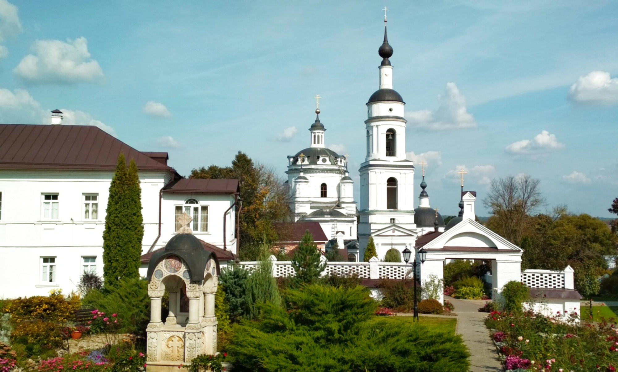 Вид монастыря, запечатленный на фотографии, отражает плоды многолетних трудов по возрождению обители. После закрытия в 1918 году и decades запустения монастырь был возвращен Церкви в 1991 году, а в 1993 году обрел статус женской обители. Под руководством игумении Николаи (Ильиной) началось масштабное восстановление всех строений, включая и Церковь Корсунской иконы Божией Матери.