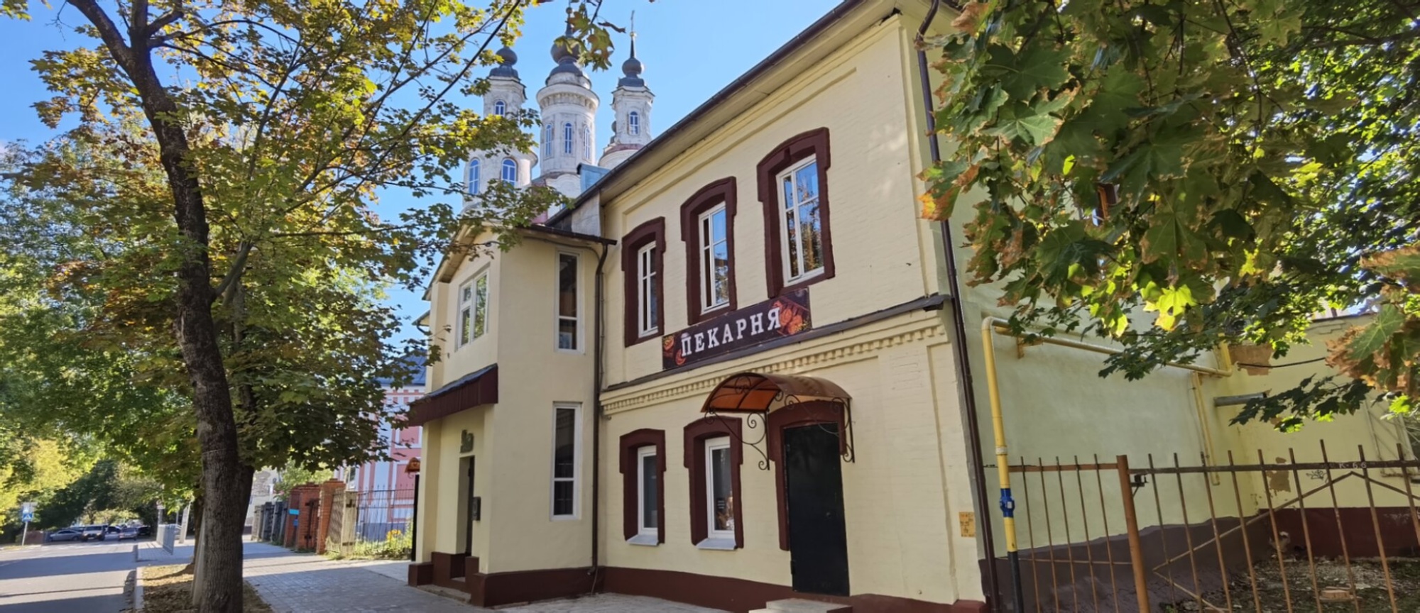 Церковь, виднеющаяся на фотографии, имеет богатую историю. Она была построена в 1794 году на средства купца Ивана Теренина и является ярким образцом стиля барокко в калужском церковном зодчестве. Храм был освящён в честь христианских святых, почитаемых как покровители ремесленников, кузнецов и врачей. Таким образом, соседство храма и хлебного заведения представляется глубоко символичным, напоминая о духовных основах любого человеческого труда.