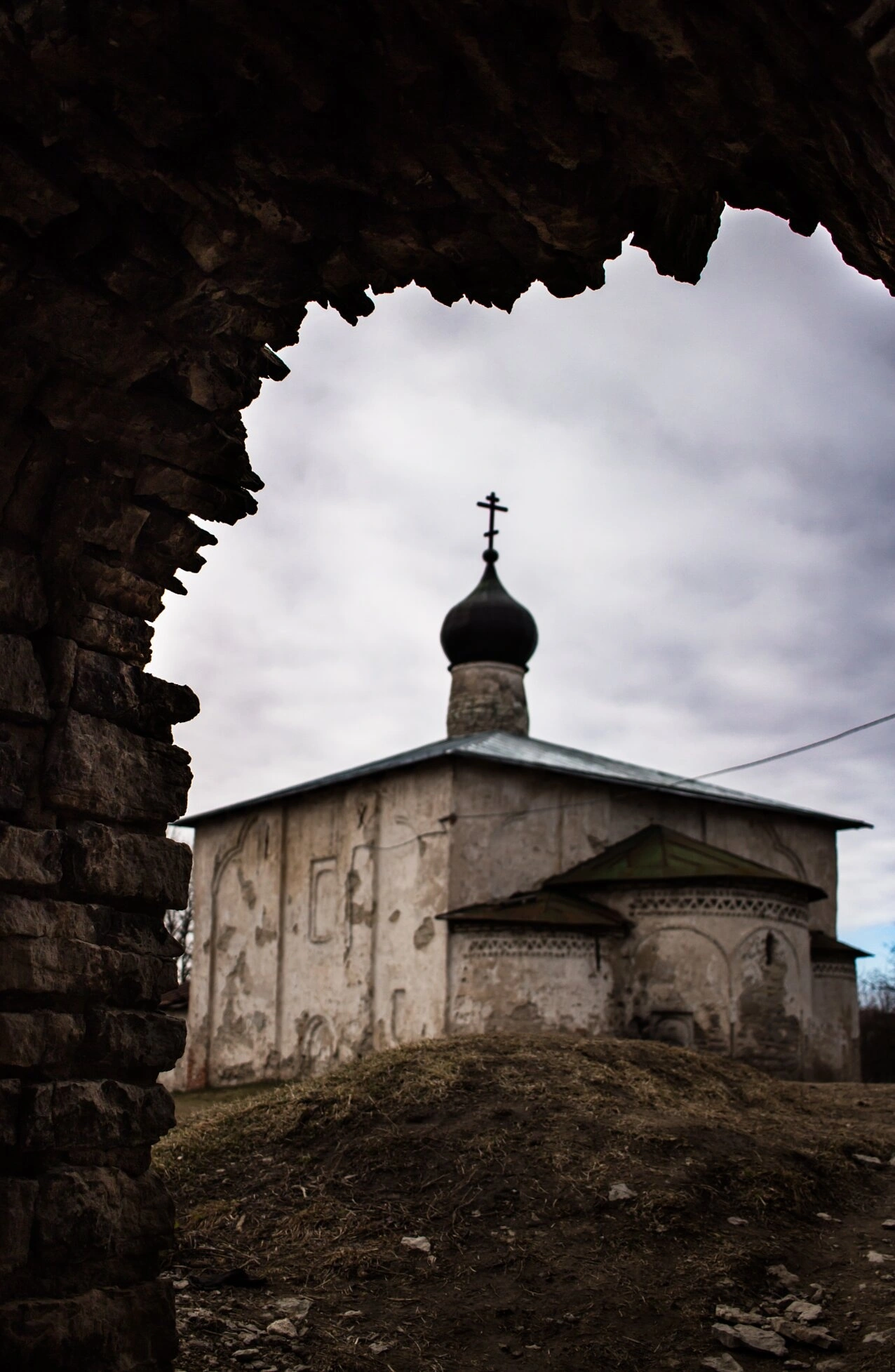 На представленной фотографии запечатлён вид на старинную православную церковь во имя святых бессребреников и чудотворцев Космы и Дамиана, что на Гремячей горе в древнем Пскове. Снимок сделан сквозь арочный проём фрагмента сохранившейся каменной кладки, что придаёт кадру эффект глубины и связывает времена, напоминая о бренности мирского и вечности духа.