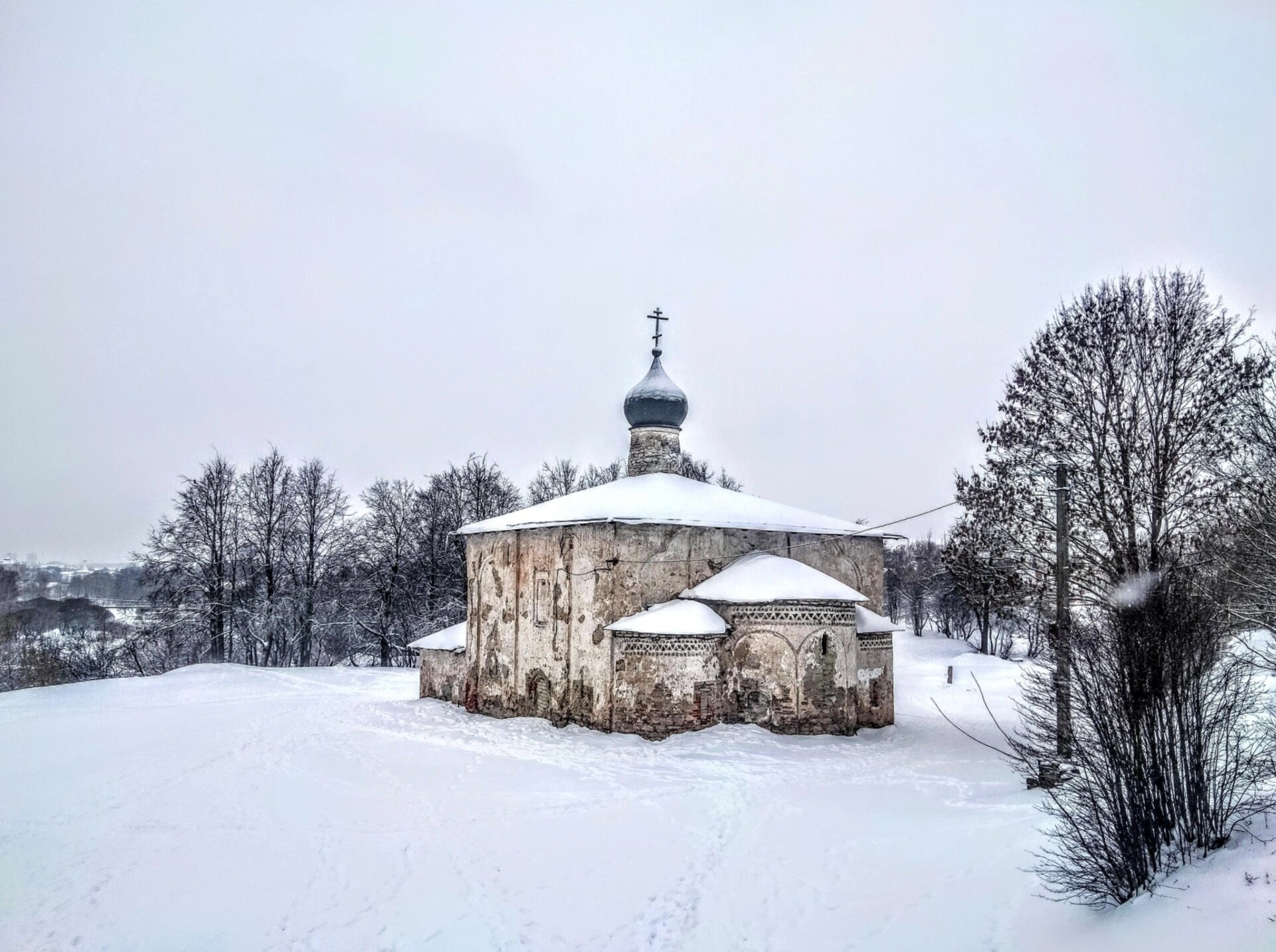 На фотографии запечатлён величественный образ древней Церкви Космы и Дамиана, что на Гремячей горе в Пскове, укрытый благодатным зимним покровом. Храм, освящённый в честь святых бессребреников и чудотворцев Космы и Дамиана, предстаёт в тихом величии морозного дня. Его каменные стены, выдержавшие не одно столетие, и шатровая колокольня мирно покоятся под пушистым снегом, а купол, увенчанный православным крестом, сияет особой благодатью под зимним небом.
