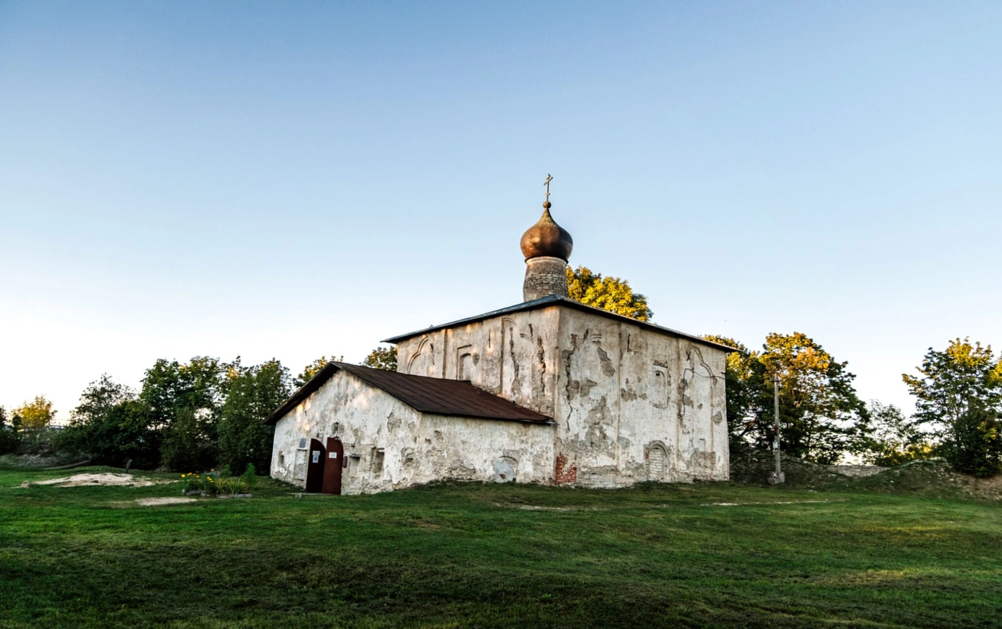 На представленной фотографии запечатлён вид на православный храм во имя святых бессребреников Космы и Дамиана, что на Гремячей горе в древнем Пскове. Этот выдающийся памятник древнерусского зодчества расположен на правом берегу реки Псковы, в исторической части города, известной как Запсковье.