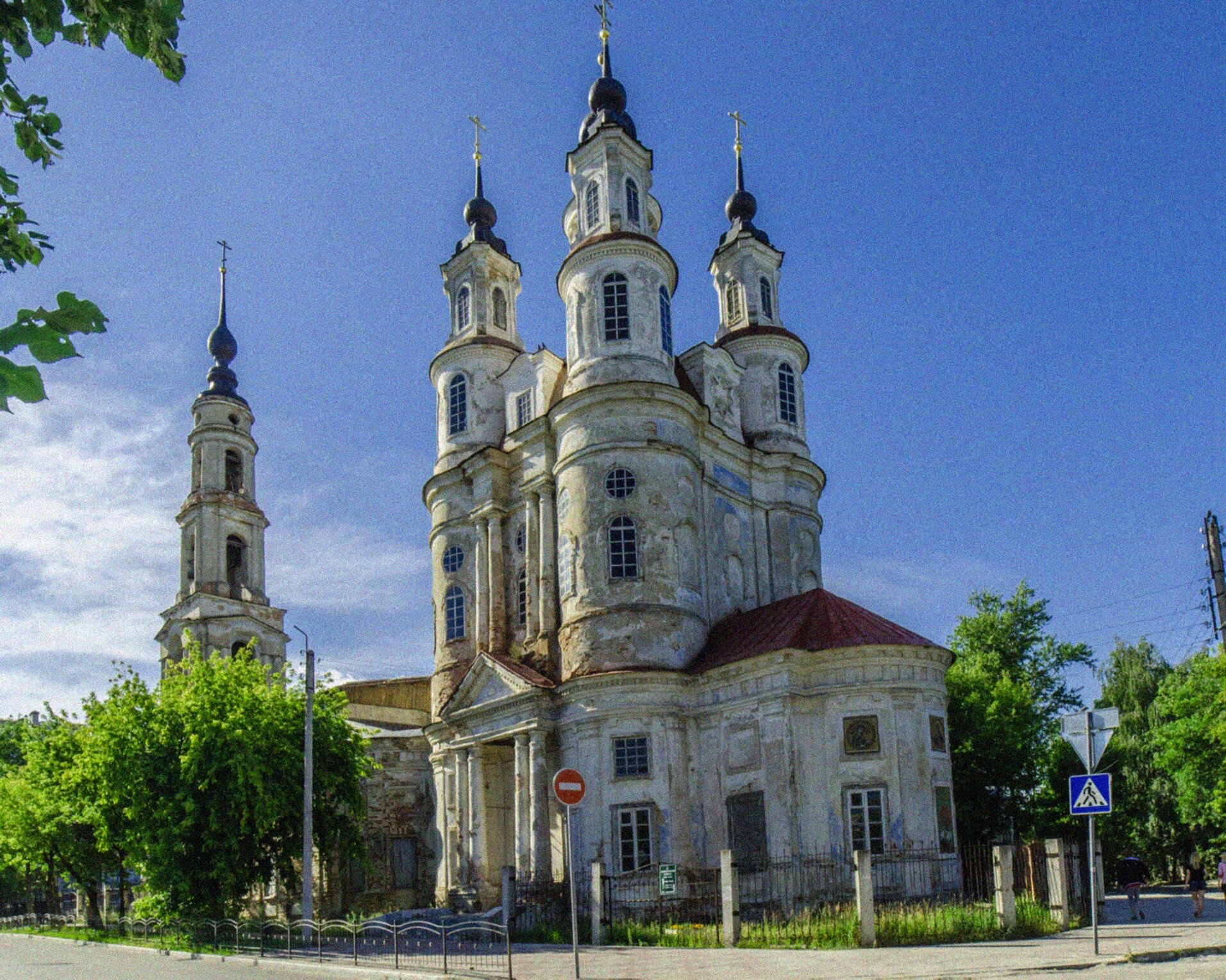 На представленной фотографии запечатлён храм в честь святых бессребреников Космы и Дамиана Римских, расположенный в городе Калуге на улице Суворова. Этот православный храм является значимым памятником церковной архитектуры XVIII века и объектом культурного наследия.