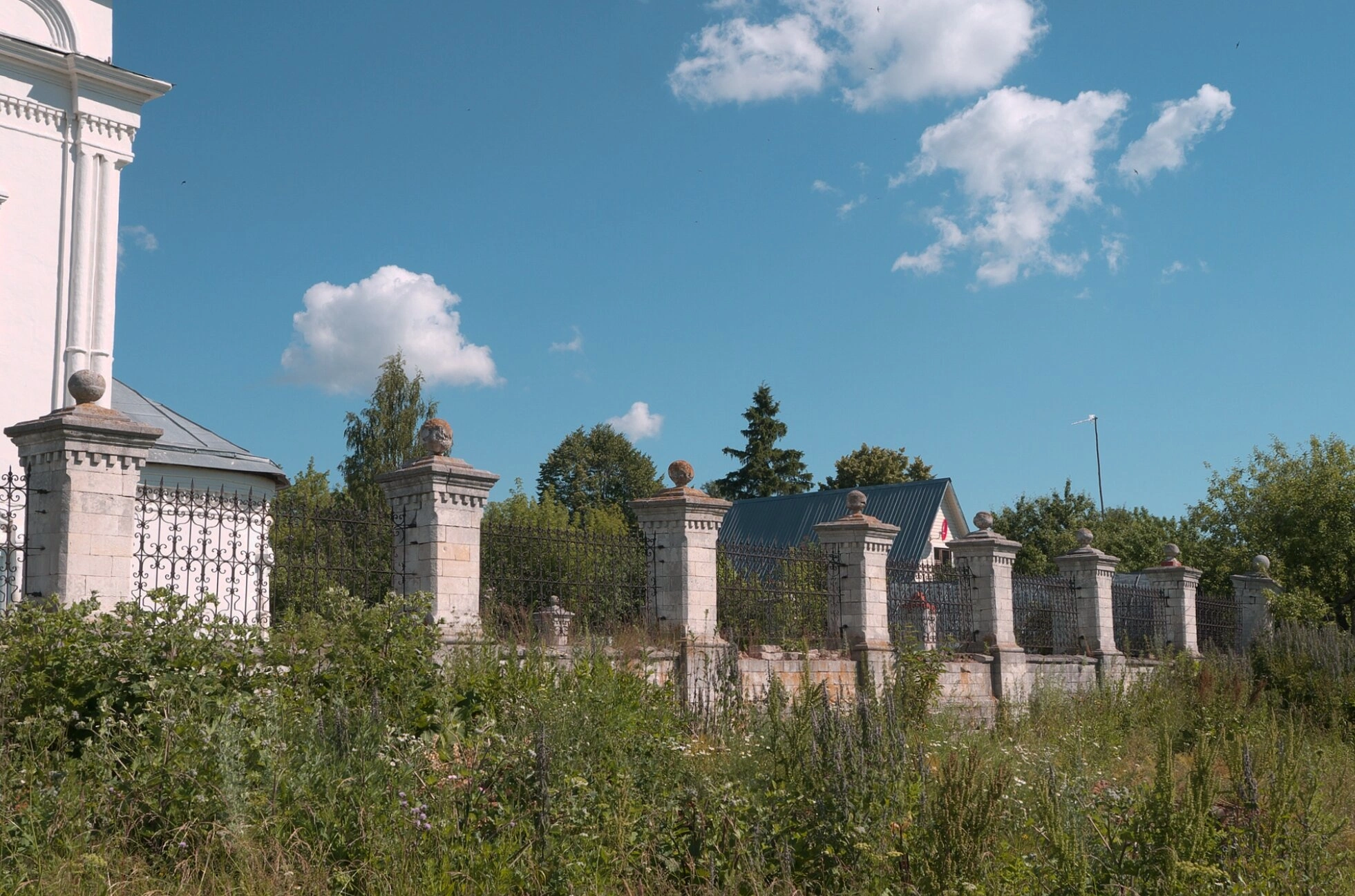 В левой части кадра видна часть белокаменного церковного здания, демонстрирующая характерные элементы православной храмовой архитектуры. Фасад украшает изящный карниз с рядом декоративных выступов, создающих благородный облик святыни. Территория храма обнесена основательной каменной оградой с массивными столбами, между которыми установлены кованые металлические секции. Некоторые столбы ворот украшены художественными декоративными элементами, подчеркивающими значимость этого сакрального пространства.