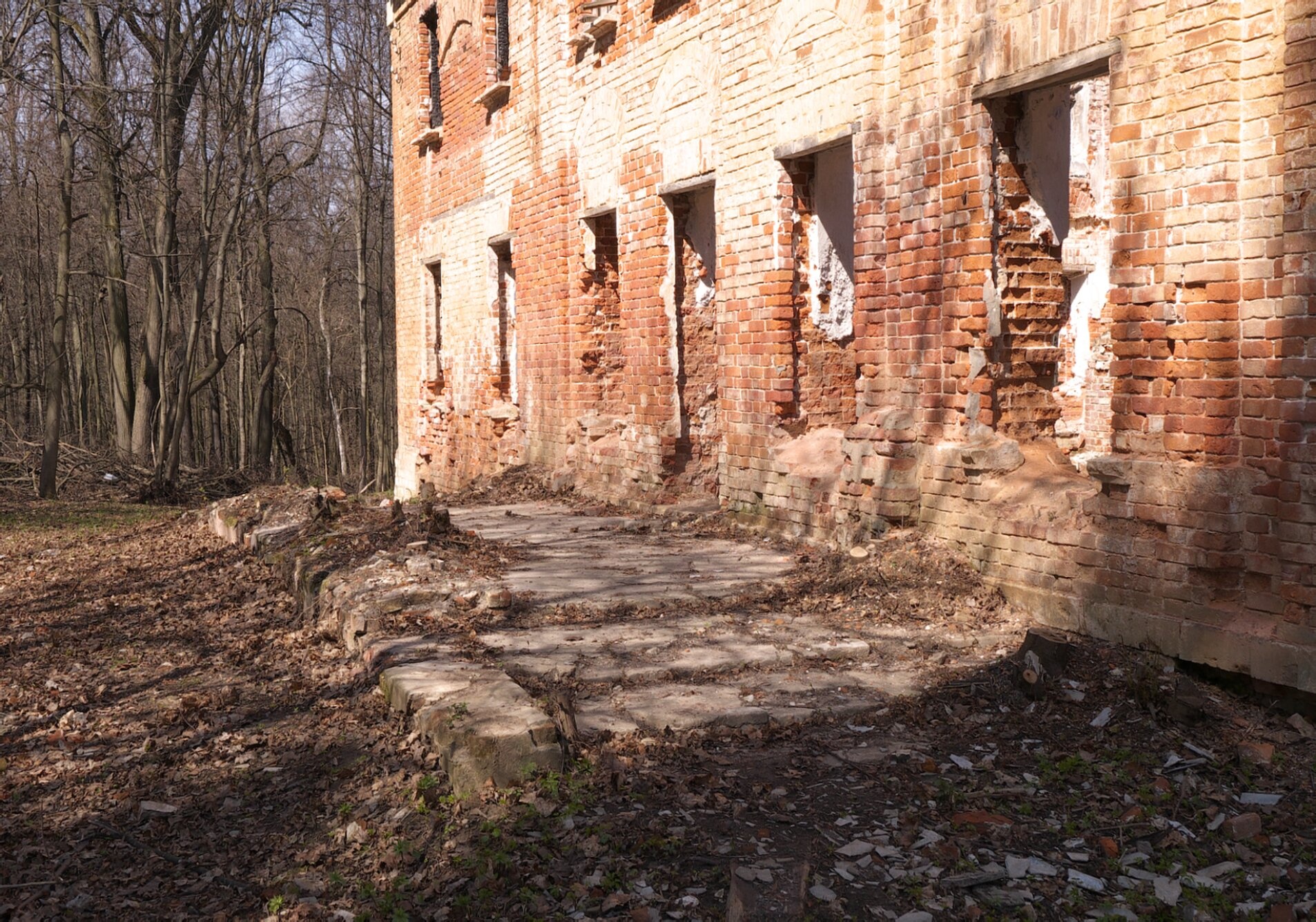 Кирпичные стены древней церкви несут на себе следы многолетнего забвения и разрушения. Лишённые кровли своды открываются к небесам, оконные проёмы зияют пустотой, а кладка постепенно осыпается под воздействием времени и непогоды. Перед храмом простирается заросшая тропинка, усыпанная осенней листвой, что свидетельствует о съёмке в межсезонье.
