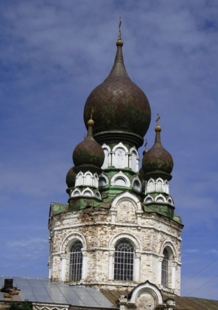 На представленной фотографии запечатлён величественный верхний ярус храма в честь святых бессребреников Космы и Дамиана, что располагается в селе Каракша Яранского района Кировской области. Изображение позволяет в деталях рассмотреть архитектурное совершенство и благолепие этой православной святыни.